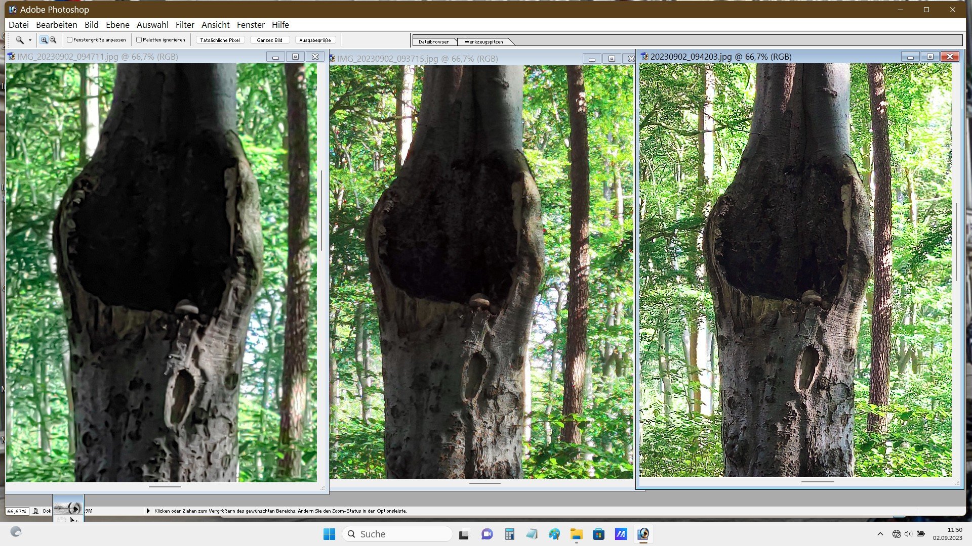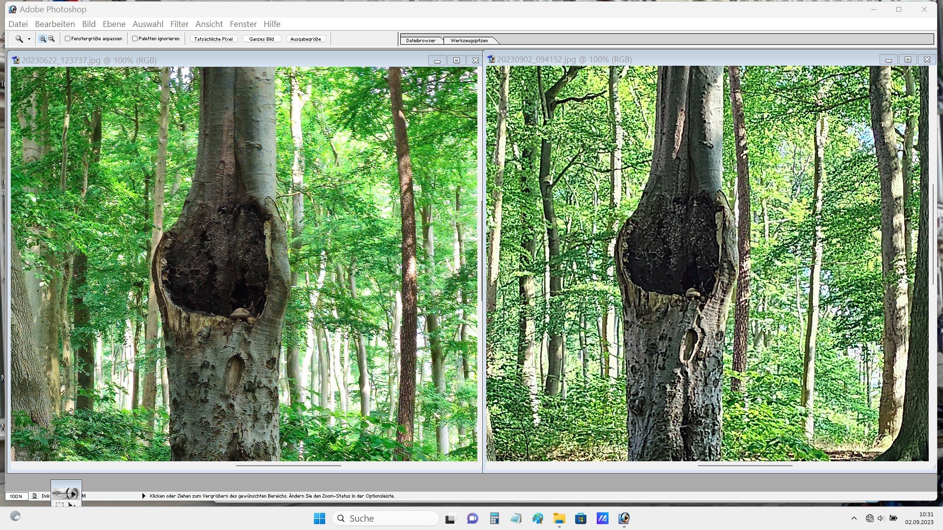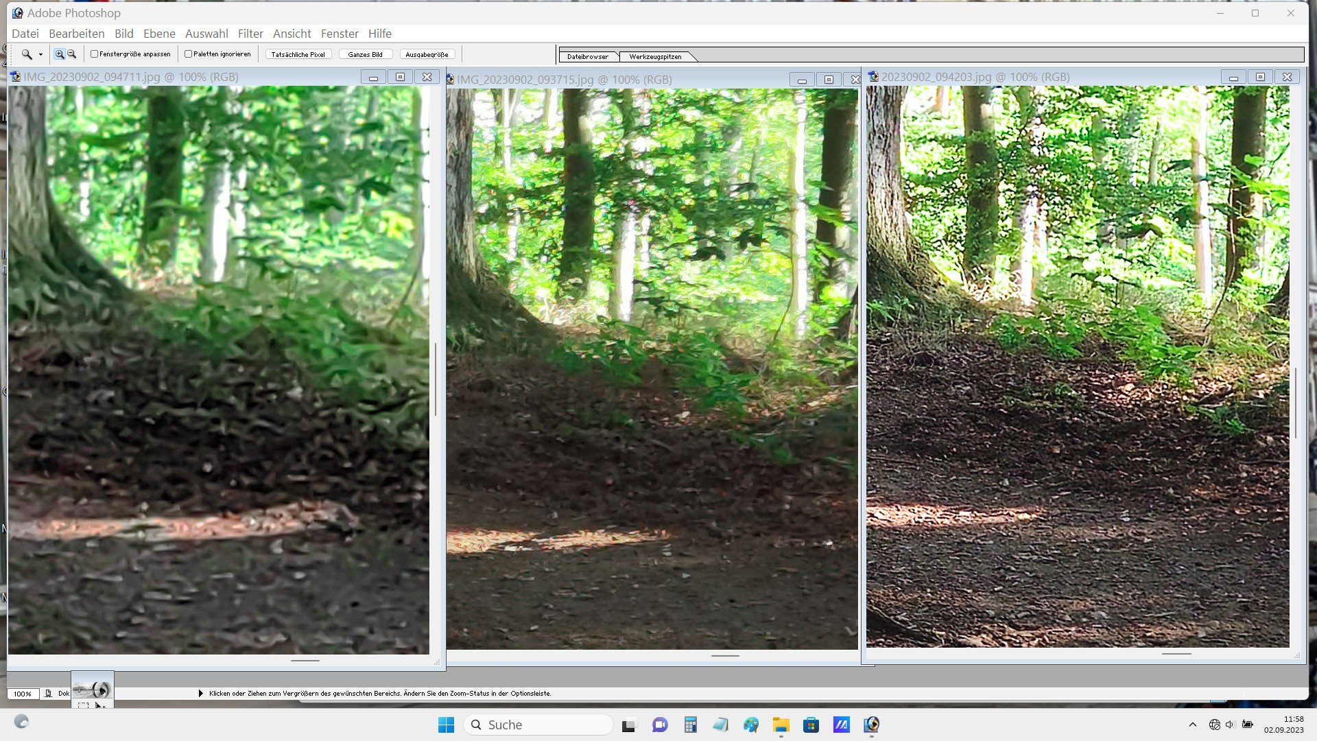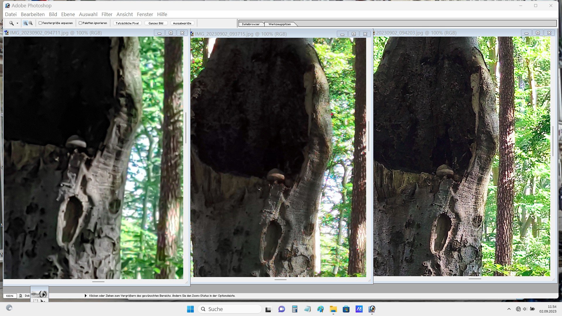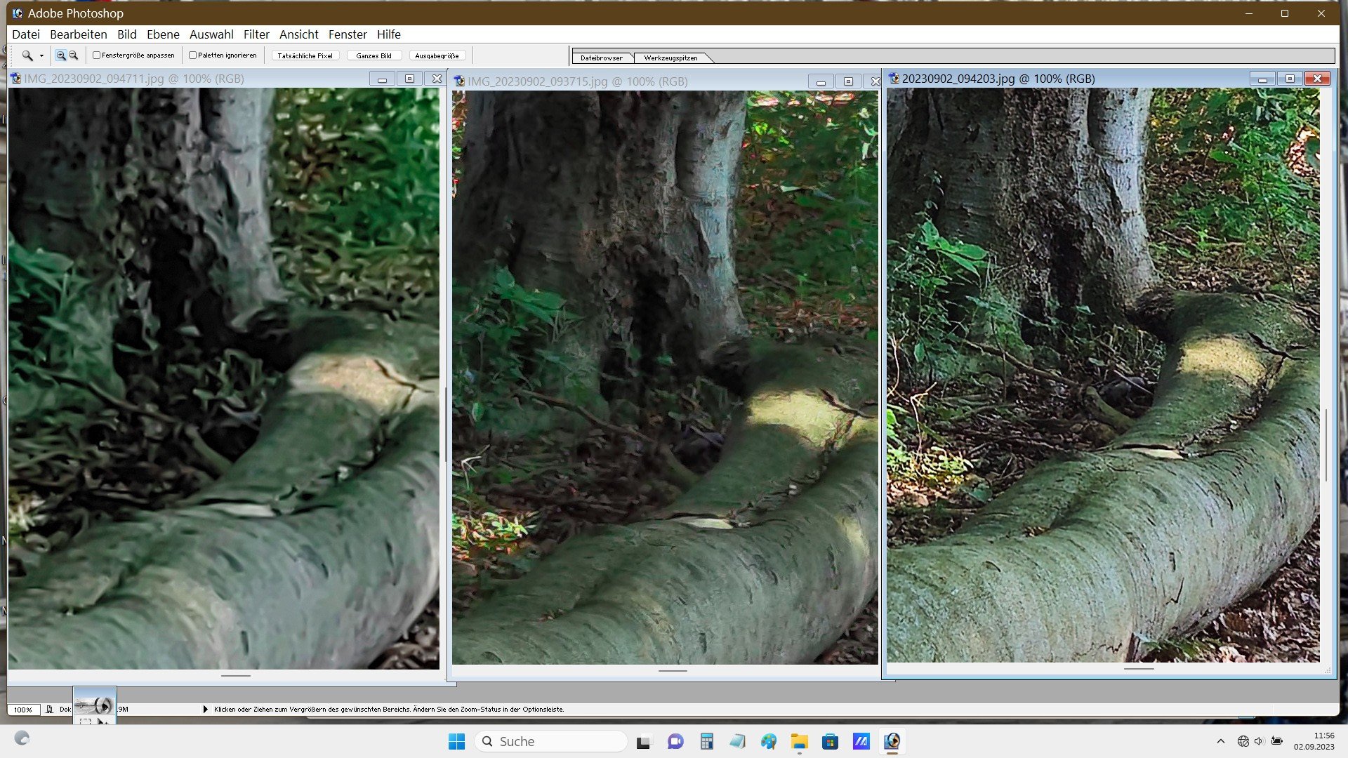 Nun. Aus meiner Sicht sind die Fotos völlig ok. Du machst ein Landschftsfoto. Wo sollen da bei 10 MPix nach einem 4x4 Pixel-Binning bei diesem Motivabstand die Details herkommen? Dadurch wirkt ein Foto überschärft. Es wird ja nur jedes 16te Pixel verwendet.
