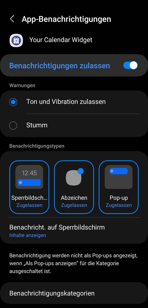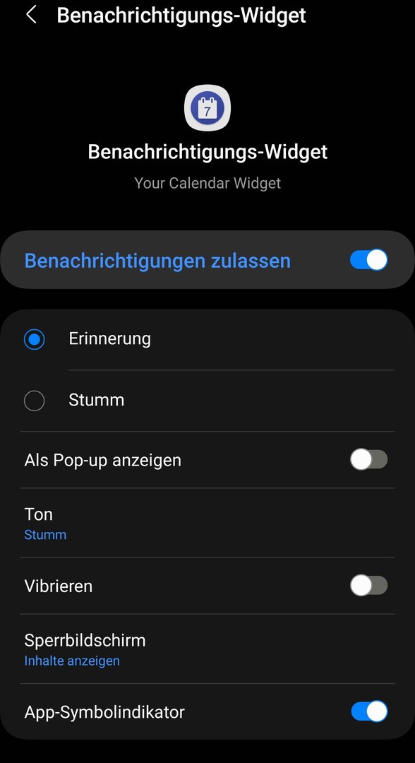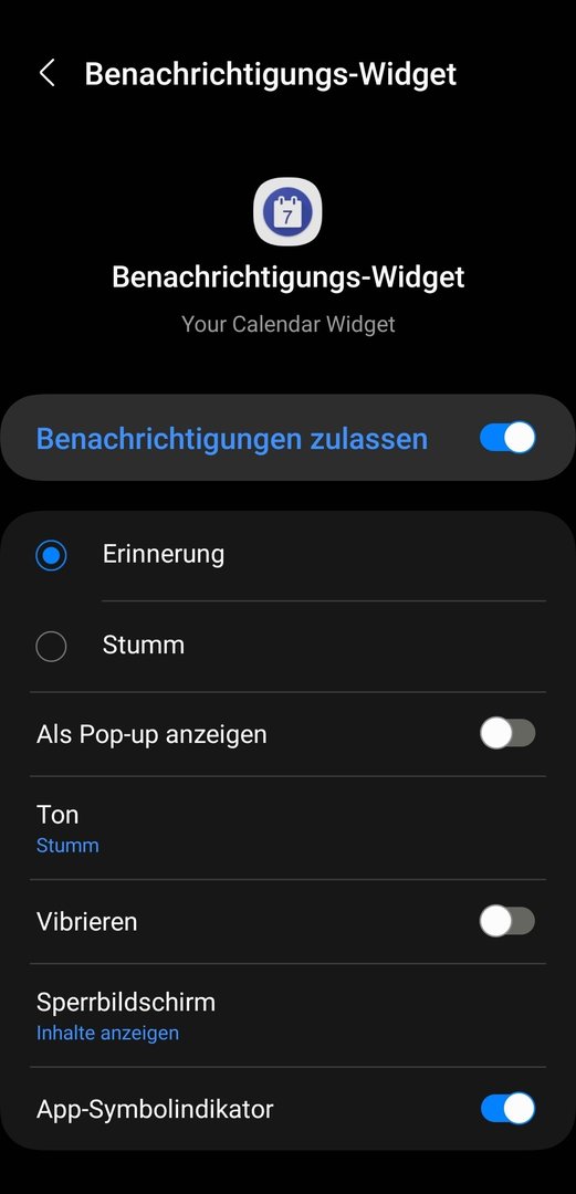 Im Your Calendar Widget habe ich das Benachrichtigung-Widget aktiviert, um die Termine für heute und morgen anzuzeigen.