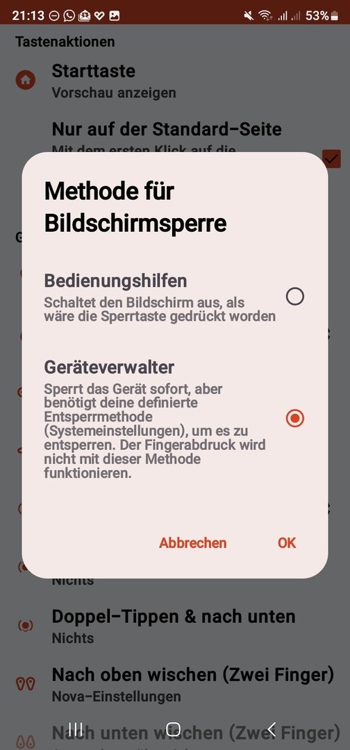 Öffne erst die Apps in den Einstellungen, such den Nova Launcher und öffne den entsprechenden Eintrag. Dann klickst Du oben rechts auf die drei Punkte und erlaubst die Zugriffe. Anschließend zurück zu den Eingabehilfen, dann klappt das. Ist ein neues Sicherheitsfeature von Android 14.sonny32 schrieb:ich kann den Nova Launcher gar nicht mehr unter Eingabehilfen - installierte Apps aktiven.