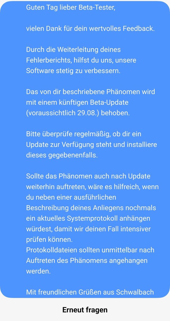 Auch wenn die Beta 1 für eine Beta gut läuft, gibt es doch einiges was behoben werden könnte. Bis dahin hoffe ich auf ein baldiges Update