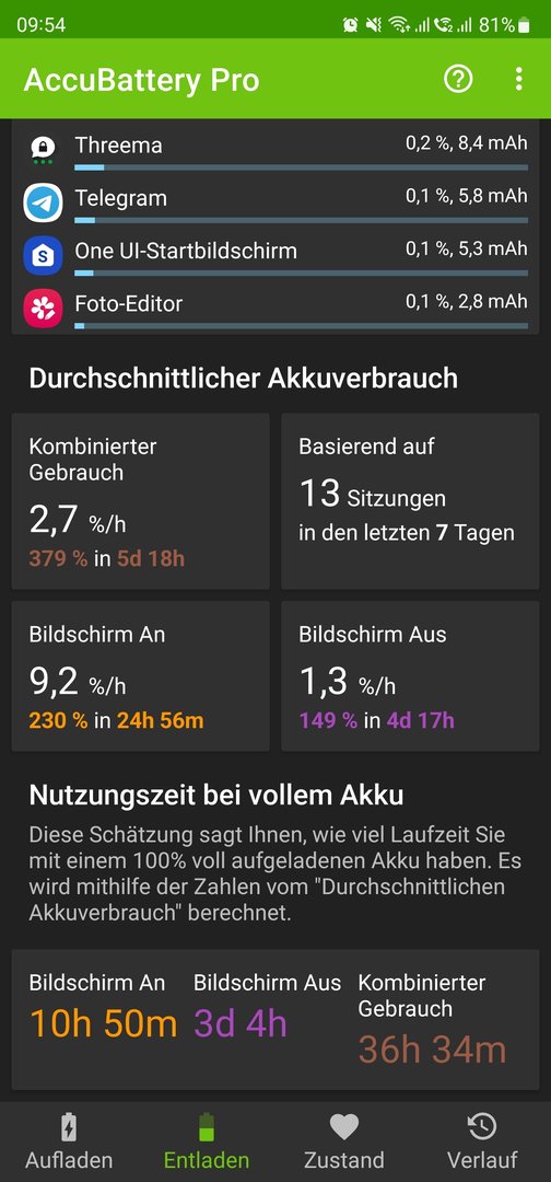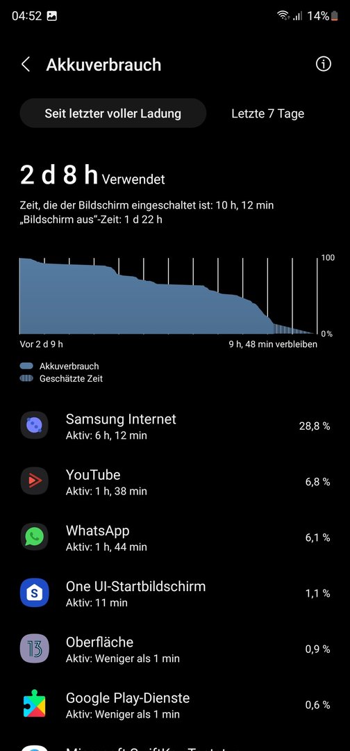 Ja Light ist an. Sonst aber nichts. Habe mittlerweile bessere Werte. Wie gesagt, nach ca. 10-14 Tagen optimiert sich alles viel viel besser. Obwohl die HUK App (Telematik Sensor für das Auto) viel verbraucht. Vielleicht ist es nicht mit dem iPhone vergleichbar, aber wenn man vom s22 U kommt, dann ist es ein Traum. Ganz ehrlich, 2 Tage "Muss" es nicht halten. Ich bin dauernutzer... aber es hält Locker 1 Tag. Bei 40% hatte ich früher Angst raus zugehen. Mit 28% jetzt fahre ich noch zum Fitnesstudio für 2 Std / Youtube Music und Twitter nebenbei dauernd... gaaanz easy.iamnotkurtcobain schrieb:@dvt91 und noch 50% Akku übrig. Genial. Hast du den light mode aktiviet?