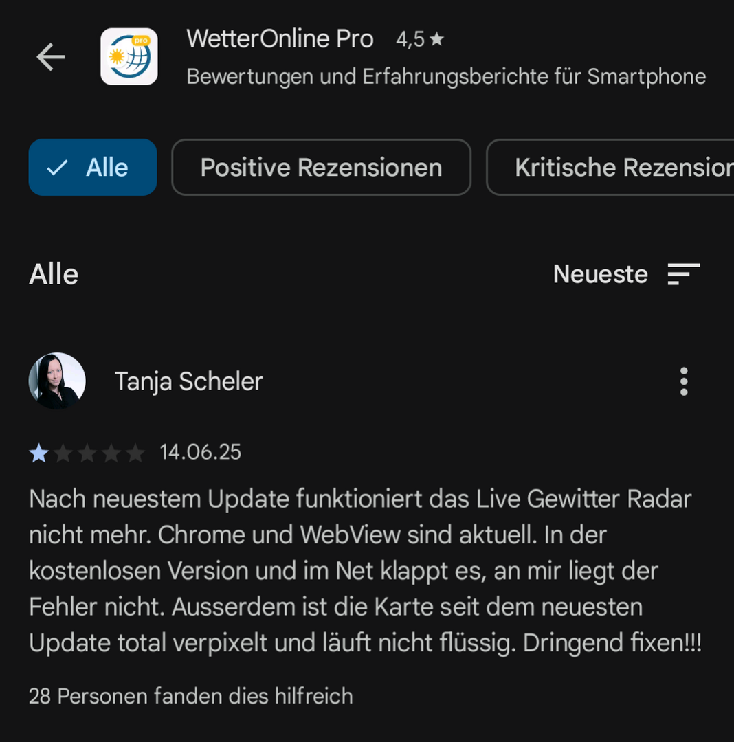 Auf der Seite WindRadar fehlen die Windfahnen (Windrichtung) und die Windgeschwindigkeiten. Auf der Seite Blitzradar kommt die Fehlermeldung das mein Gerät WEB GL nicht unterstützt. Das hat bis jetzt aber alles funktioniert. Ausserdem soll ich sicher stellen das die aktuellen Versionen von Chrome und WebView installiert sind. Das sind sie bei mir.