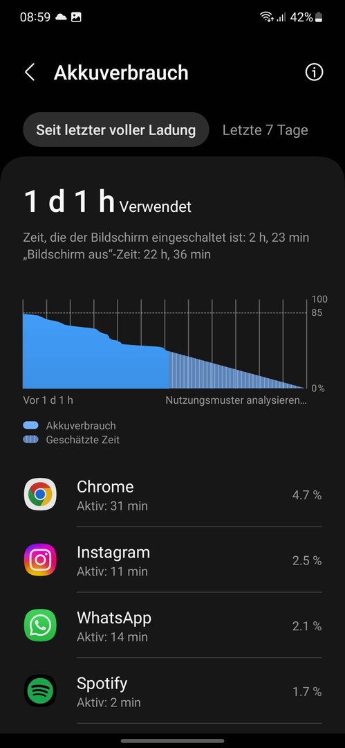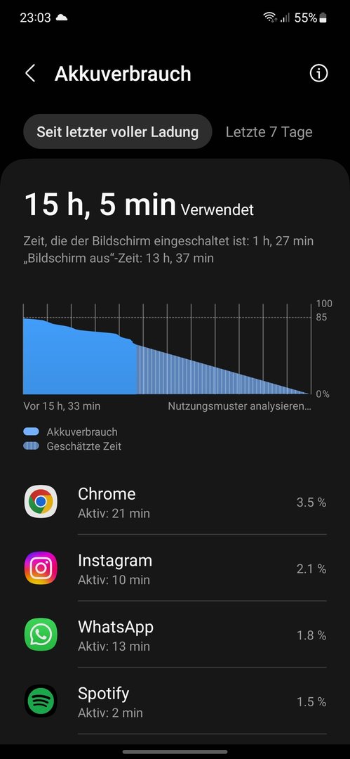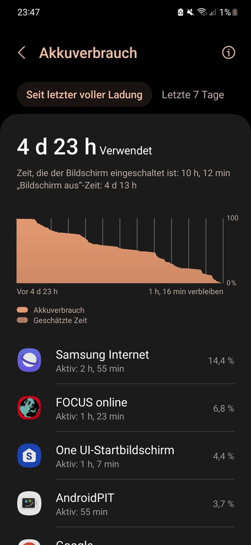 Wow, 5 Tage inkl 10h SOT ist beachtlich, unabhängig, von den Energiesparmodi. 2-3 Tage sollte dann auch mit LTE und Light Mode allein möglich sein. Ein S22 hätt nur ausgeschaltet 5d ohne Aufladung überlebtOrpheus_69 schrieb: