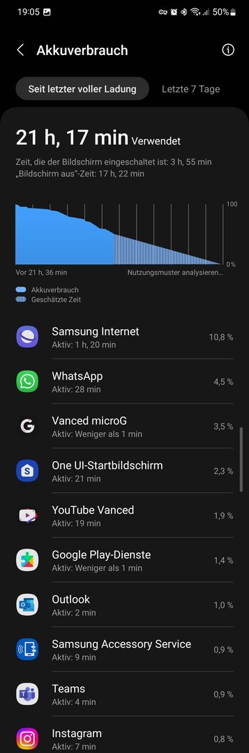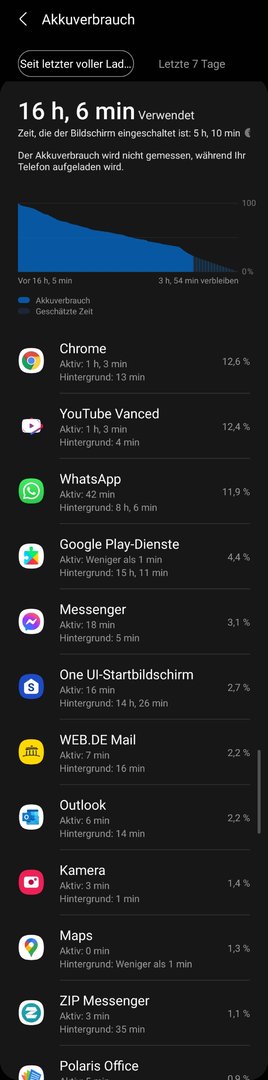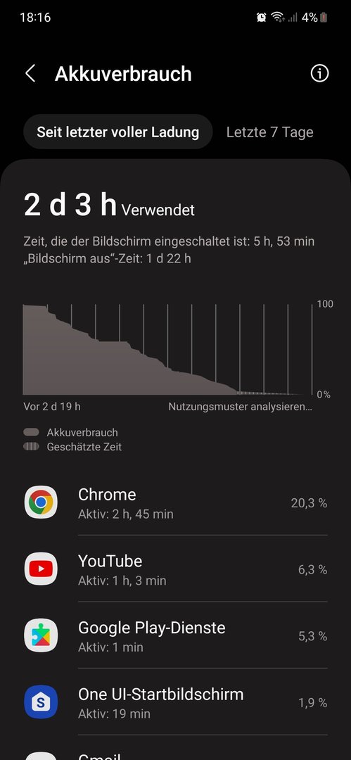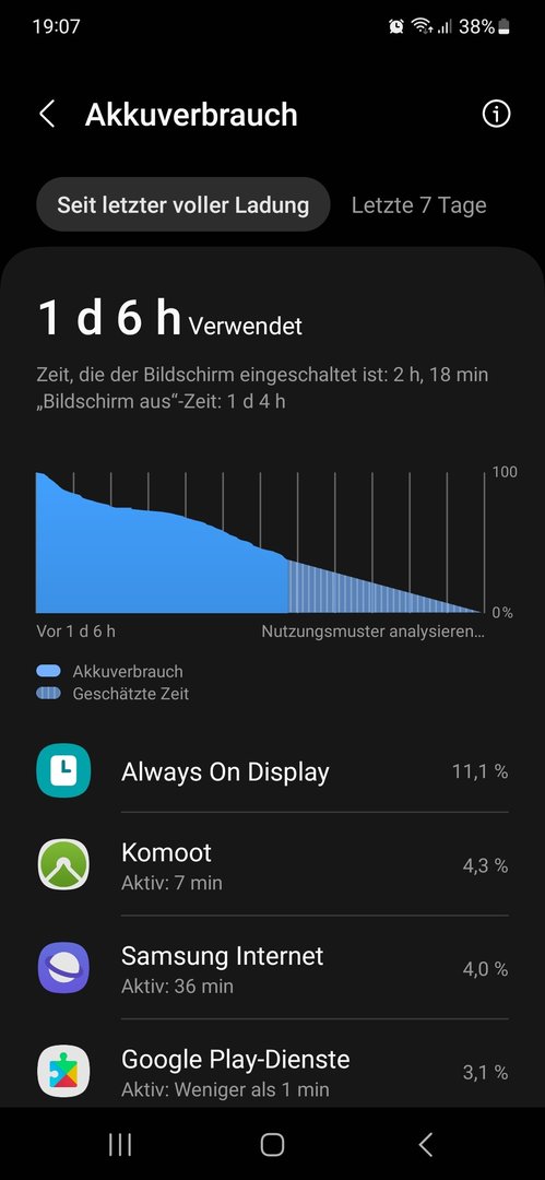 Aktuell sind es 39%, mal schauen was morgen Vormittag im Standby inkl. BT Smartwatch, WLAN etc. noch übrig ist.