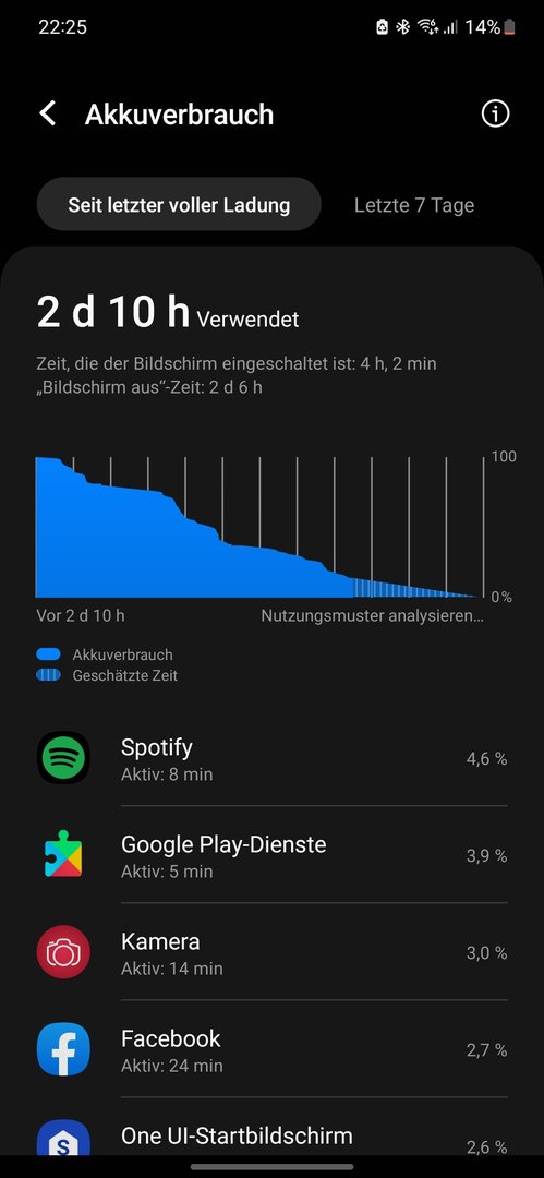 1,5 Stunden im Fitti mit einem Balken 5G und Spotify. Das hat tatsächlich am Akku gesaugt
