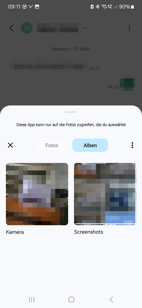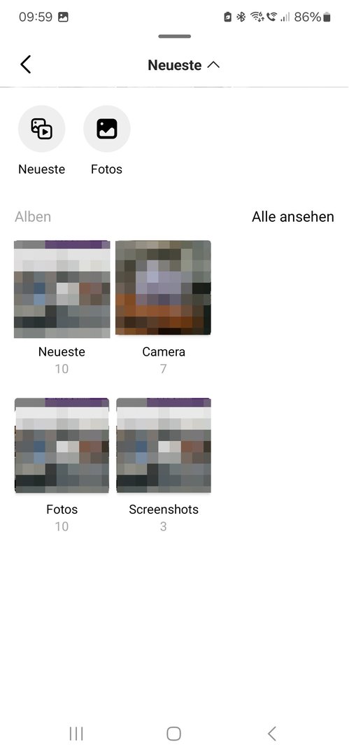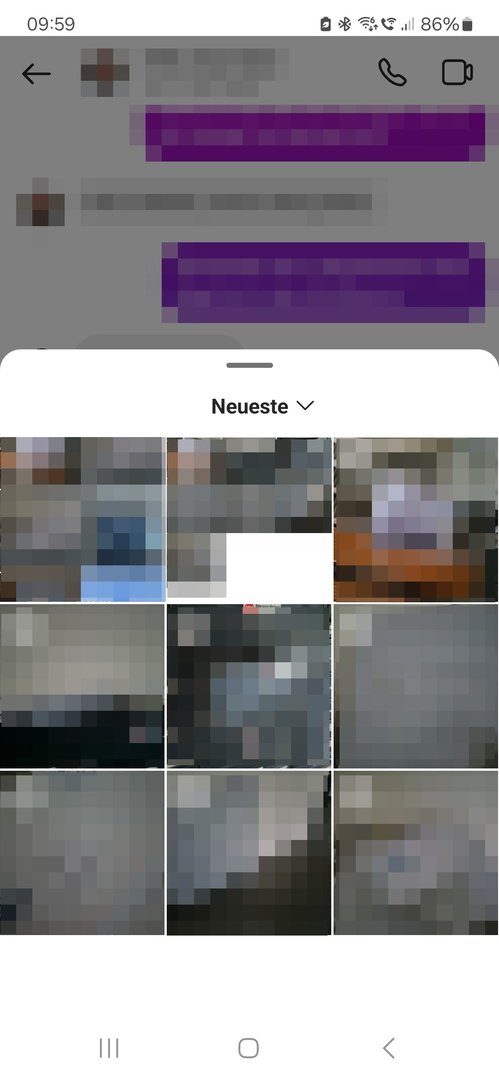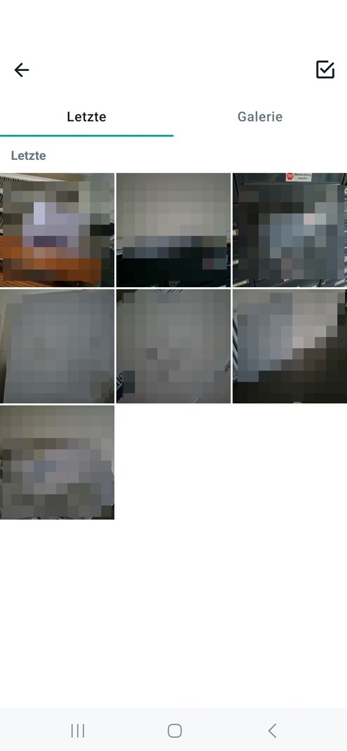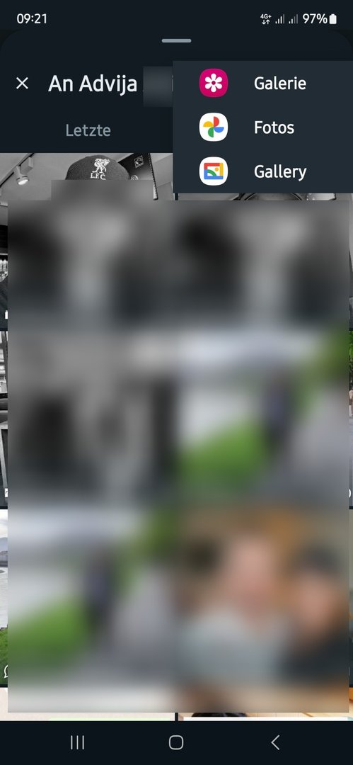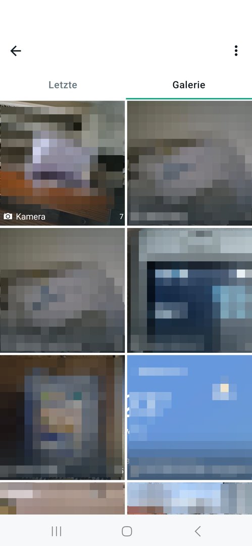 Wenn ich nun aus WhatsApp oder Instagram Fotos senden und/oder hochladen möchte, habe ich als Auswahlmöglichkeit nur diese zwei Fenster ("Letzte" und "Galerie"):