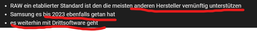 Es freut mich zu sehen, dass du dich so intensiv mit der Thematik auseinandersetzt, allerdings möchte ich dich darauf hinweisen, dass dieses Forum hier nicht der ideale Knotenpunkt für derart feststellungen ist. Es bringt leider wenig, hier auf Android-Hilfe.de darüber zu lamentieren. Falls du tatsächlich Einfluss nehmen möchtest, rate ich dir dringend, dein Anliegen direkt an die zuständige Instanz zu eskalieren. Konkret bedeutet das, du solltest dein Feedback über das Lob- und Kritikformular von Samsung einreichen. Nur so können deine Anmerkungen auch an geeigneter Stelle verarbeitet und möglicherweise berücksichtigt werden. Also, lass uns produktiv bleiben und das Problem nicht nur hier ventilieren, sondern auch dort adressieren, wo es wirklich Gehör finden kann.QualityDoesMatter schrieb:Eines der größten Mankos von Samsung Flagship Geräten ist, dass man Adobe's AI/KI Entrauschen bei RAW Bildern nicht verwenden kann und das bewirkt im wahrsten Sinne des Wortes Wunder. Ich kenne keinen anderen Hersteller der auch davon betroffen wäre. Für mich ein KO Kriterium.