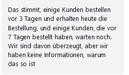 "Ihre Bestellung sollte innerhalb von 4 Wochen bei Ihnen eintreffen. Dies liegt daran, dass Sie ein exklusives Online-Modell bestellt haben, das nach einer Bestellung individuell gefertigt wird"