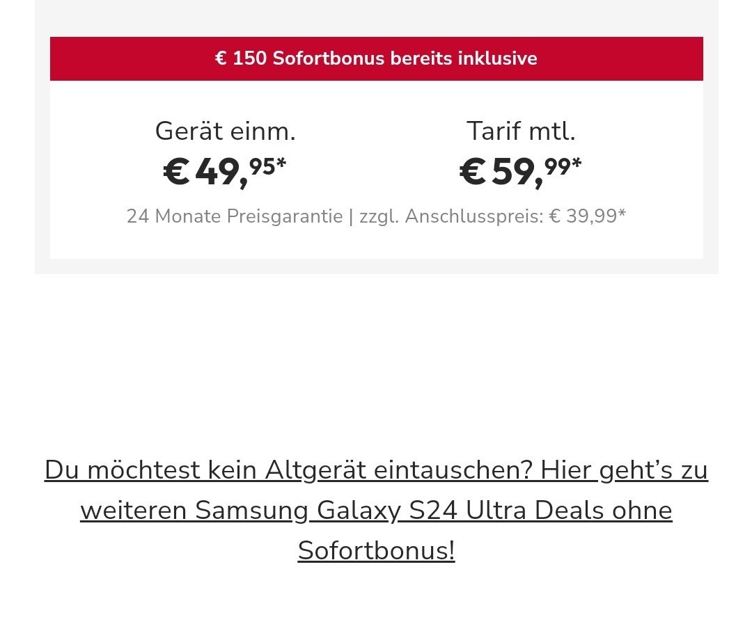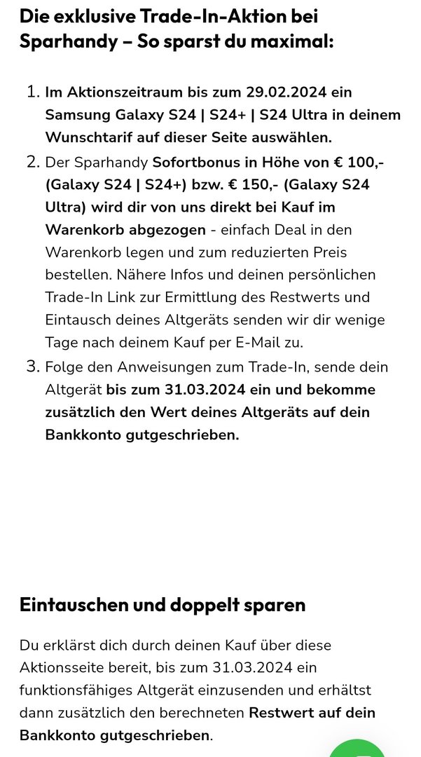 Ich habe mir das S24U als vodafone-Tarif mit trade-in ausgewählt (dummerweise, habe da selber nicht aufgepasst, wenn ich ehrlich bin. Also Eigenverschulden.) sparhandy wirbt nämlich wie folgt bei den Tarifen: Im Aktionszeitraum bis zum 29.02.2024 ein Samsung Galaxy S24 | S24+ | S24 Ultra in deinem Wunschtarif auf dieser Seite auswählen.