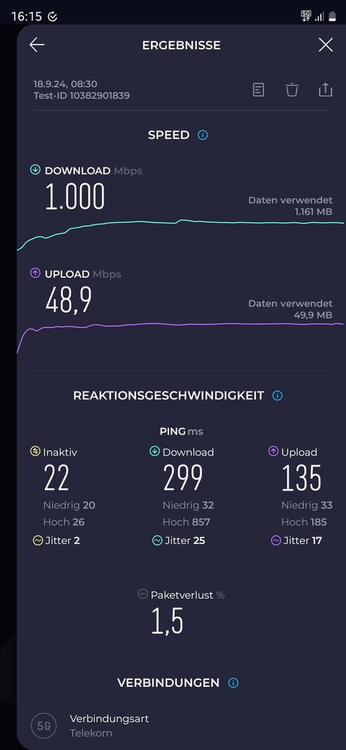 So ist es bei mir auchSF-Pille schrieb:Bei mir gibt es aktuell ein Problem, das 5G anzeigt wird, auch mit 2 Balken in der Anzeige, aber keine Daten kommen rein.