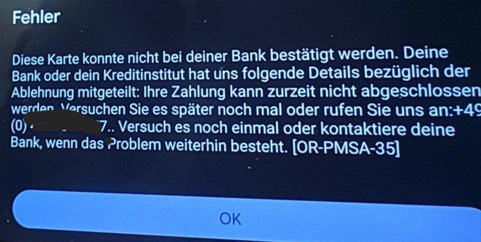 Nächstes Problem, meine Kreditkarte ist von Barclays. Seit Jahren hinterlegt und als primäre Zahlungsmethode benutzt. Seit dem S24U bekomme ich immer eine Fehlermeldung das die Zahlung nicht abgeschlossen werden kann. Mehrfache Anrufe bei Barclays, die Karte ist OK. Karte auch schon entfernt und neu eingefügt. Immer dasselbe.
