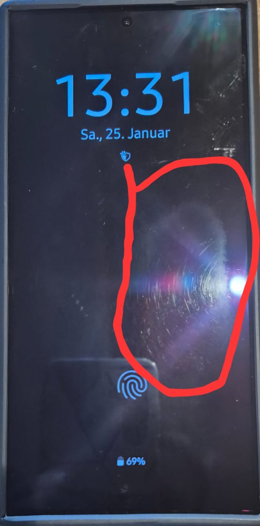 ich habe ein S24 Ultra mit abgeschürfter oleophober Beschichtung und mikrokratzern die bei angeschalteten Display nicht zu sehen sind.