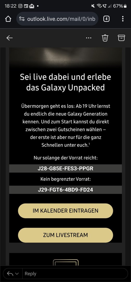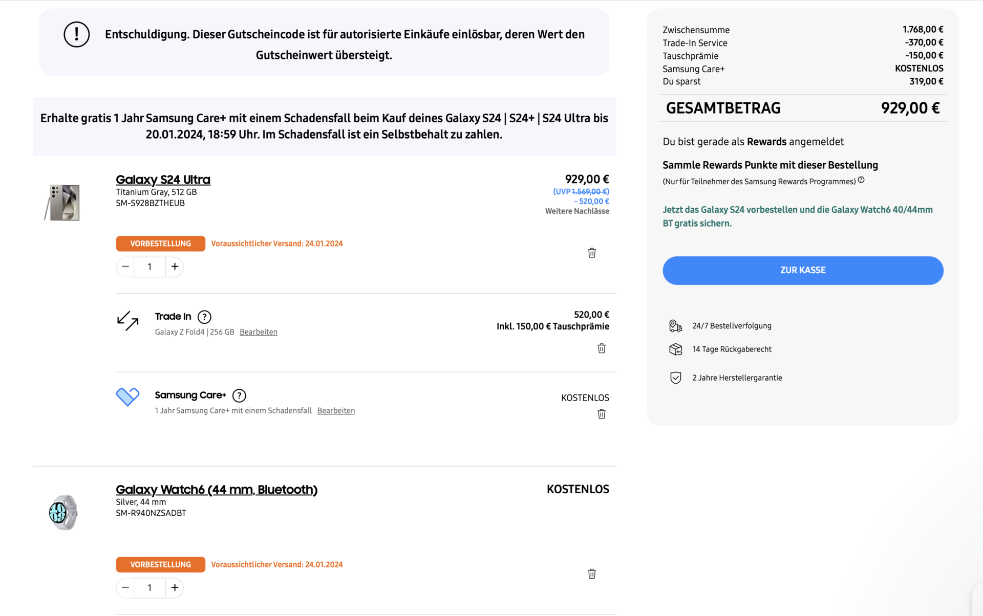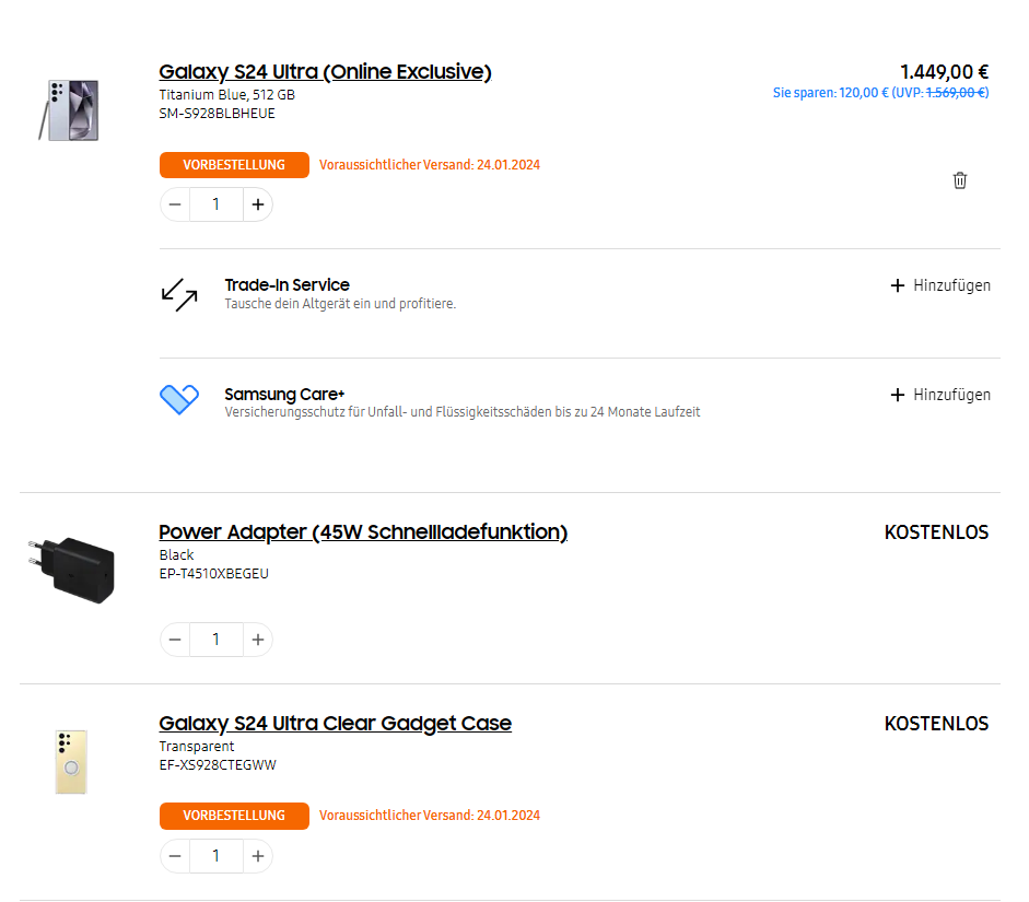 Danke, funktioniert, + kostenlose Watch 6 44mmekl69 schrieb:Ich habe gerade das S24 Ultra bestellt. Mit dem ersten Gutschein Code aus der E-Mail die vor ein paar Tagen gekommen ist, habe ich die Galaxy Watch 6 kostenlos bekommen.