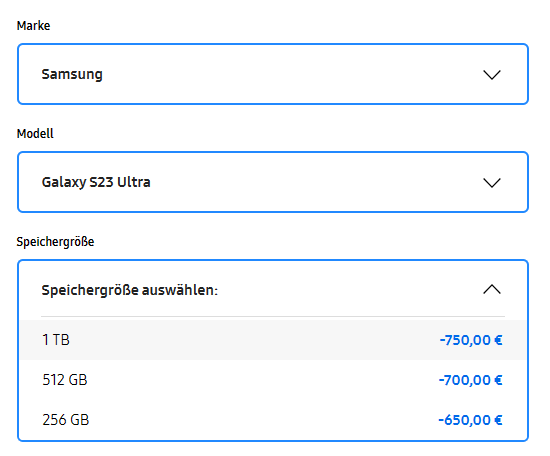 @levo91 Beim Kauf eines S23 Ultra wurden für ein S22 Ultra mit 256gb bei TradeIn 640,- angerechnet. (128gb Version -> 610,-)