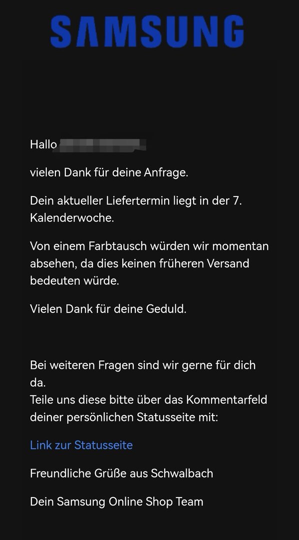 Ich tippe mal drauf, die haben uns vergessen, da wir ja schon ein Ticket offen hatten. Hab mein Liefertermin mit KW7 ja bereits am 8.2 mittags erhalten in der Mail von oben.