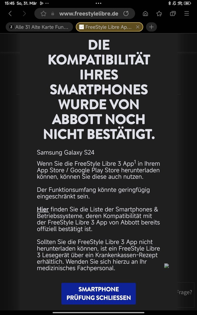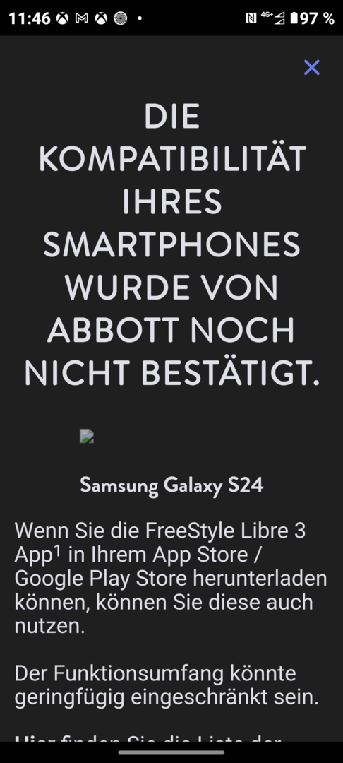 Komme vom S21 FE da hat alles problemlos funktioniert.Man muss das Nfc einschalten,damit der Sensor sich aktiviert.Alles probiert ,einfach keine Erkennung.Nfc getestet mit Gesundheitskarte diese wird erkannt,also funktioniert NFC.Bei Free Style in der kompatiblen Liste nachgeschaut S24 soll angeblich auch funktionieren.Vielleicht liegt es auch an den Exynos Chip,weil es mit den S21FE funktioniert.Vieleicht hat auch ein anderer Diabetiker die