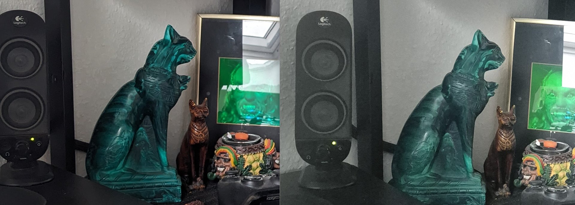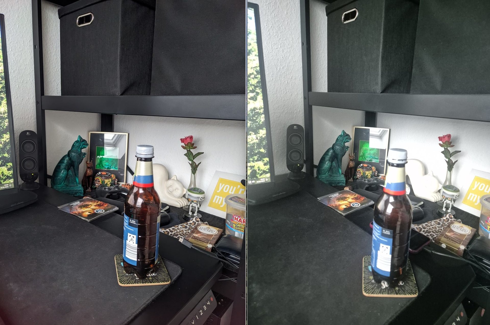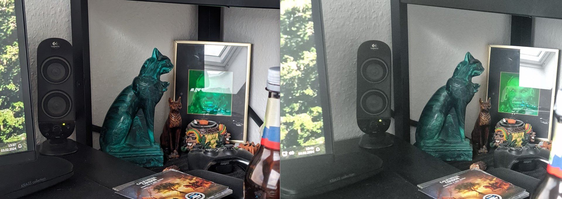 Was mich stutzig macht sind die unterschiedlichen Belichtungen. Einen direkten Vergleich kann man nur bei gleicher Belichtung machen. ISO1250 vs ISO127 führt natürlich zu mehr Rauschen und weniger Details. Und das Aufhellen kommt doch von Bildverbesserern? Ich würde in Pro Modus beide gleich belichtet einstellen und dann vergleichen.
