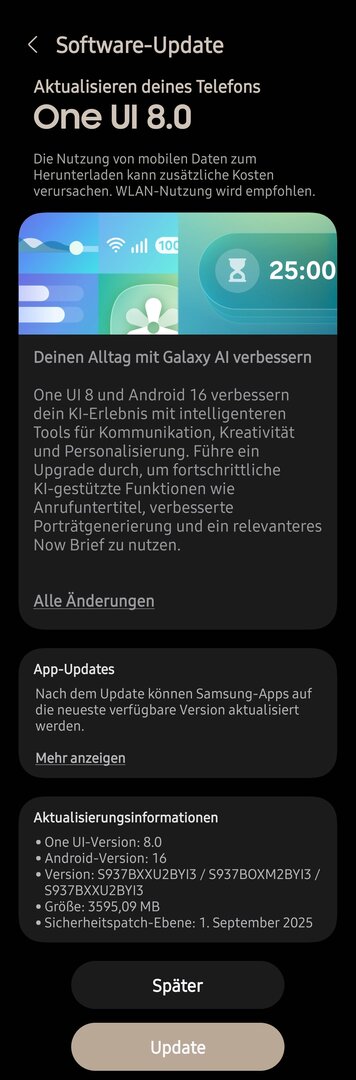 nur als kurze Info. Das reguläre One UI 8.0 mit dem September Patch und Android 16 ist auf meinem Edge angekommen. Ist knapp 3,6 GB groß.