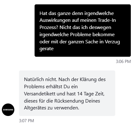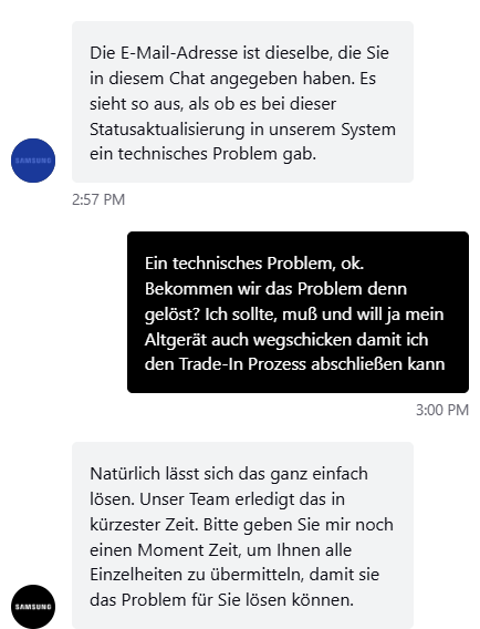 Geht in den Samsung - Chat und fragt nach der Trade-In-ID auf Basis eurer Bestellnummer. Im allerbesten Fall habt ihr einen "Matthias Albert" auf der anderen Seite. Der hat mir die Trade-ID gegeben und dann habe ich auf der FoxWay-Status-Seite mit der alten EMail-Adresse den Status auch einsehen können. Der gute Mann hat mir direkt die Labels im Chat überreicht.