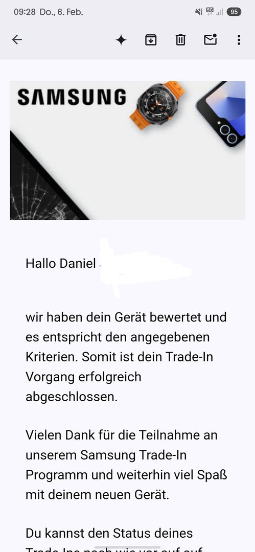 Ich habe den Fehler gefunden!!!! Ihr MÜSST zwingend handeln. Eure Zeit tickt bereits. Ich gehe davon aus, dass ihr alle irgendwann eure Mail-Adressen, mit der ihr euch in Samsung einloggt geändert habt. In der Vergangenheit wurde auch von Foxway die neue genommen, aber diesmal nicht.