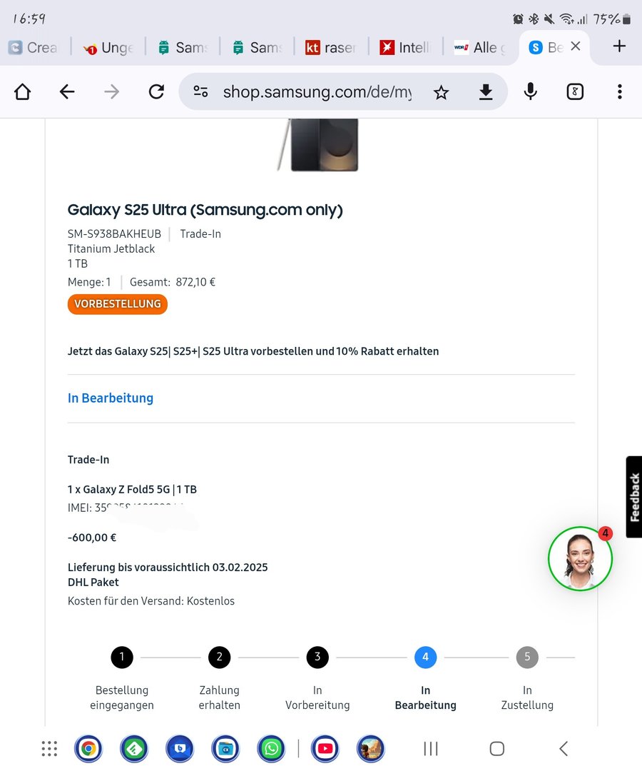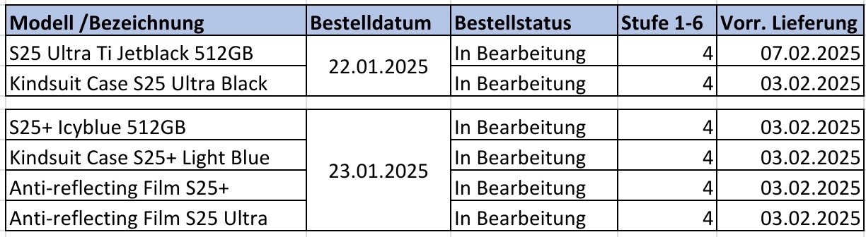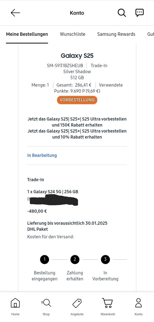 Nur mal so am rande, hab das jetzt schon mehrmals gesehen, dass die leute die IMEI von ihrem Trade In gerät verpixeln. Mit der Nummer kann man nichts anfangen ohne auch im Besitz des Gerätes zu sein, also spart euch die mühetcfy schrieb:Status Änderungen für das S25U