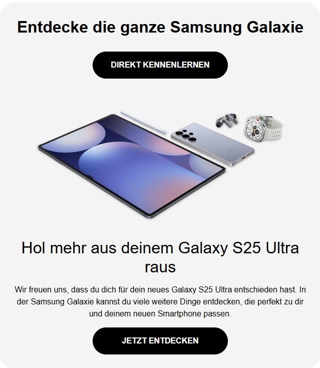 Hol mehr aus deinem Galaxy S25 Ultra raus Wir freuen uns, dass du dich für dein neues Galaxy S25 Ultra entschieden hast. In der Samsung Galaxie kannst du viele weitere Dinge entdecken, die perfekt zu dir und deinem neuen Smartphone