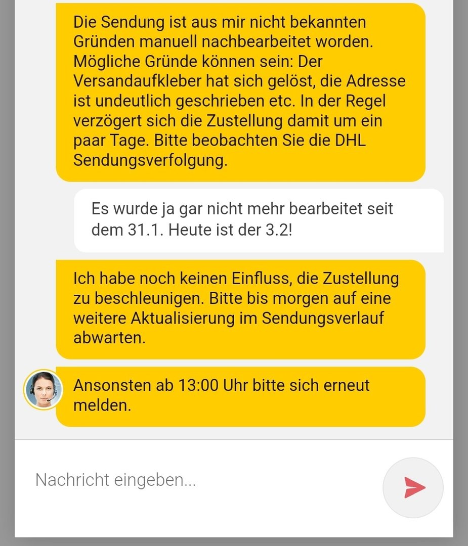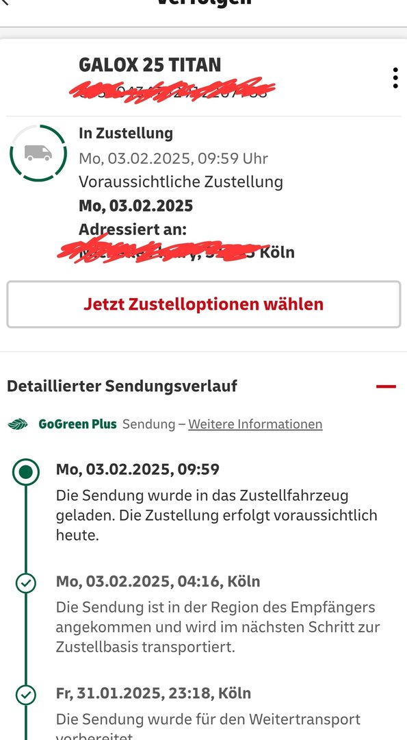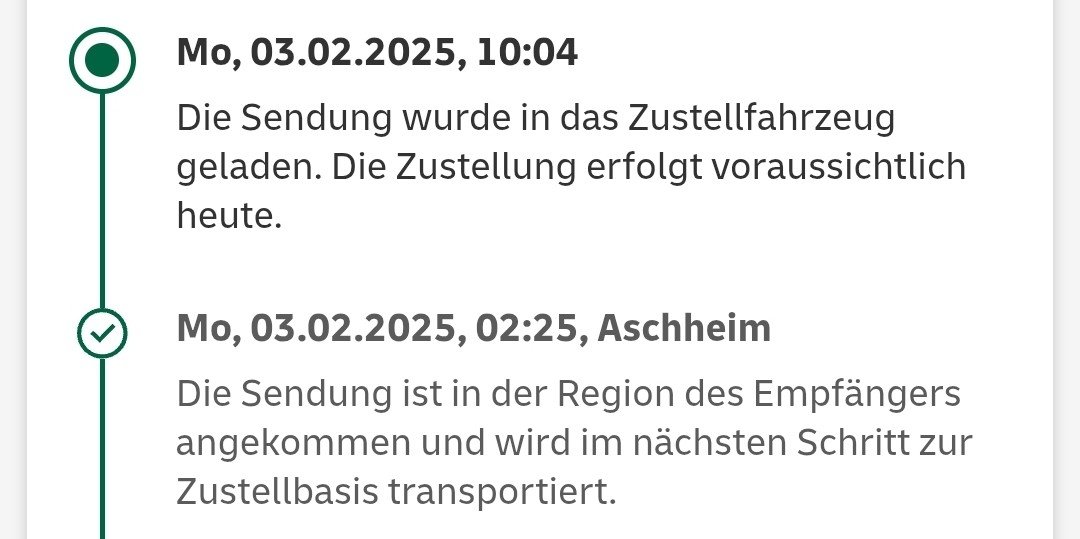 Nytro schrieb:Was steht bei dir? Beim Kumpel aus Spandau wurde das Ding um 00:52 Uhr in Börnicke nochmal gescannt und befindet sich jetzt auf dem Weg in die Zustellbasis