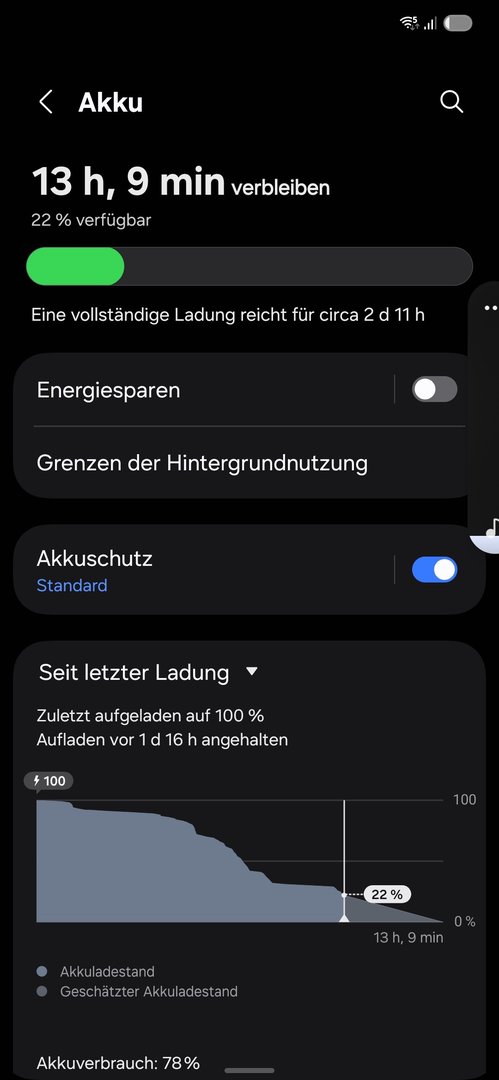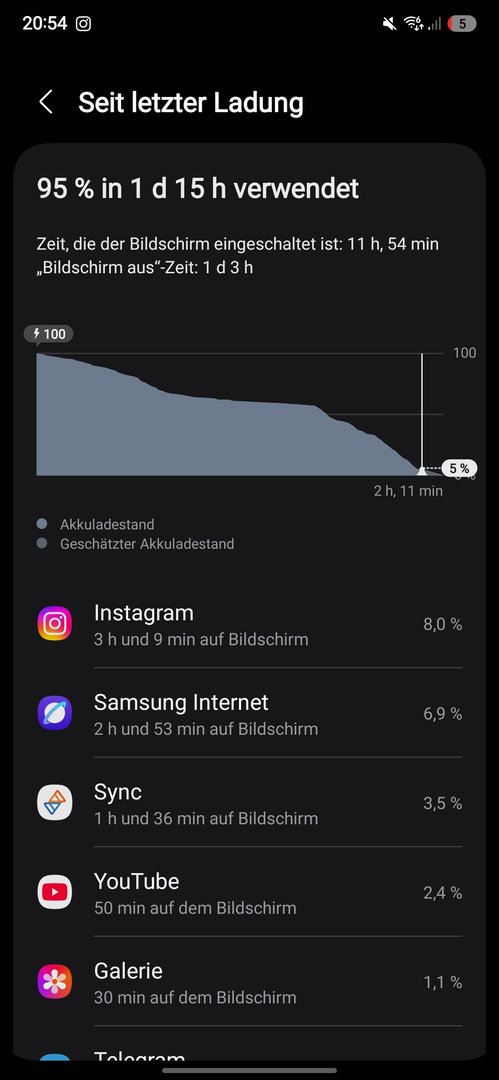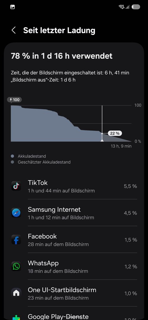 . Wie war die Nutzung? Überwiegend WLAN? Kam gestern mit Nutzung WLAN ca 90 % und 10% mobile Daten auf 1,5 Tage auf 1 Tag und 10 Stunden. Dot war bei 10h und 56 min. Habe bei den 10% Rest Akku dann geladen.
