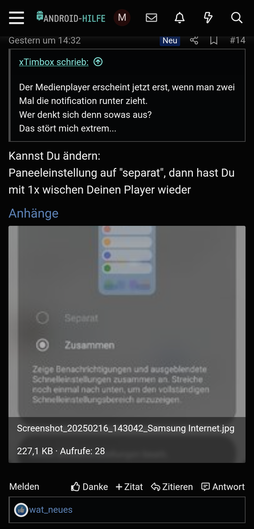 Hallo, ich habe das Problem, dass wenn ich den Bildschirm oben runterziehe, NICHT in die ganzen Einstellungen wie Bluetooth, WLAN etc. komme, sondern in den Benachrichtigungsbildschirm, erst wenn ich ein zweites Mal wenn rechts nach links wische, kommt es. Wie geht das, wie bei Android 14, dass es sofort da ist wie vorher?