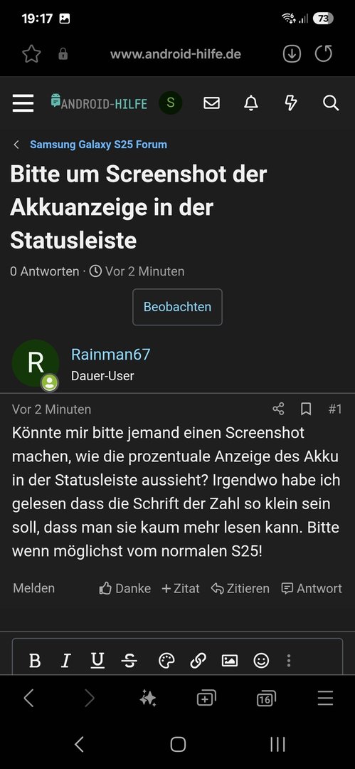 Könnte mir bitte jemand einen Screenshot machen, wie die prozentuale Anzeige des Akku in der Statusleiste aussieht? Irgendwo habe ich gelesen dass die Schrift der Zahl so klein sein soll, dass man sie kaum mehr lesen kann. Bitte wenn möglichst vom normalen S25!