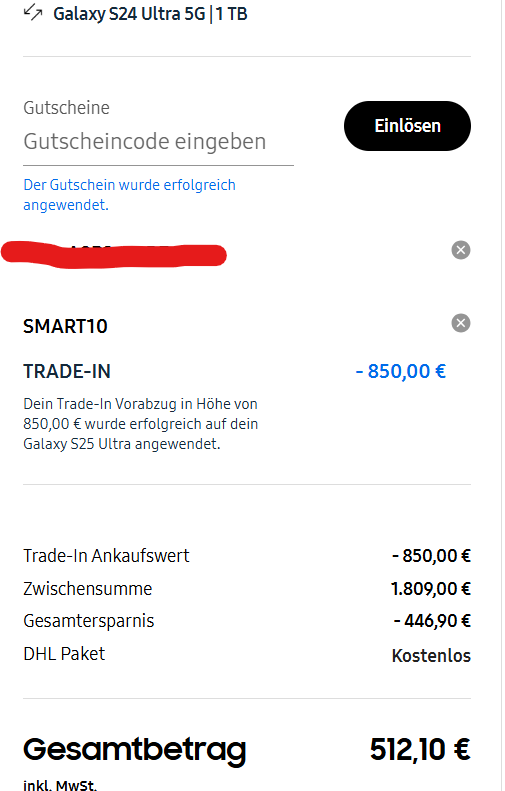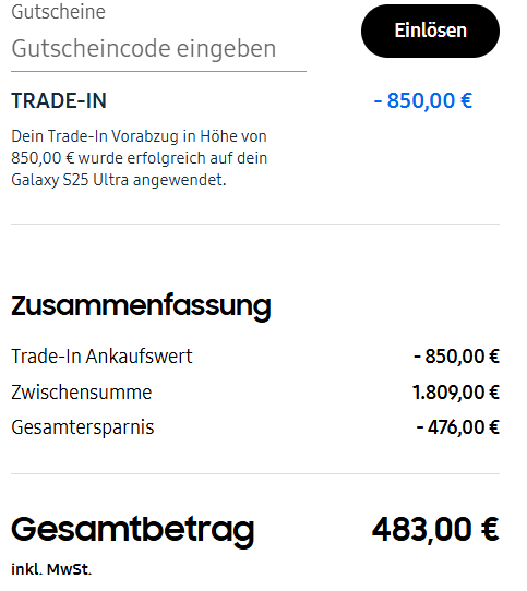 obwohl mich registriert hab wenn also jemand ein Code noch übrig hat gerne bitte per PM schicken. Vielen DankHab mein S24+ Import ganz normal als Trade in angegeben. IMEI wurde bestätigt und 580€ bekomme ich dafür. Macht dann 360€ für mein S25+ 512GB.tralax schrieb:Ist das garantierter trade in auch von import Samsung geräten?