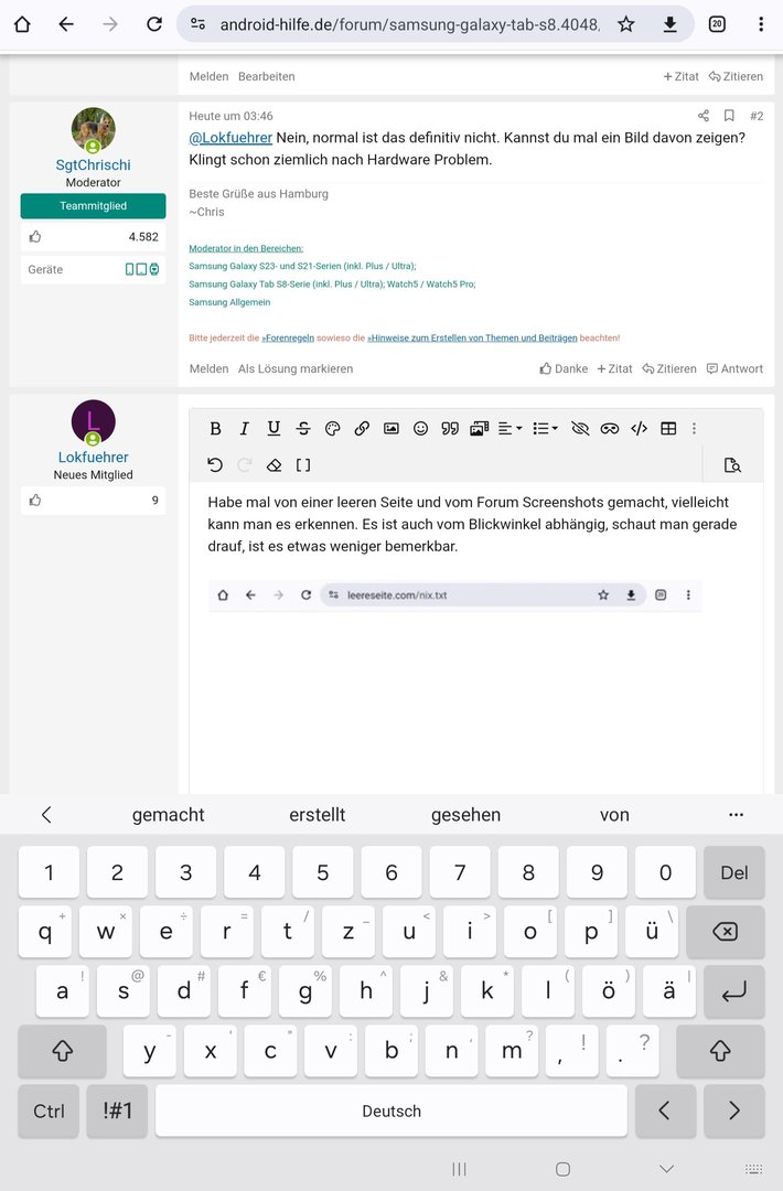 Hallo, ich habe seit letzter Woche ein Samsung Tab S8 und beim Display ist mir aufgefallen, dass es bei weißen Hintergründen, so wie auch hier im Forum, auf der linken Seite leicht grünlich und rechts rötlich ist. Mein altes Tab A8 von 2020 hat das nicht, da ist alles fast durchgehend weiß, obwohl da auch der Augenschutz eingestellt ist. Wenn ich den deaktiviere, bleibt es aber auch so. Helligkeit habe ich bei ca. 40%.