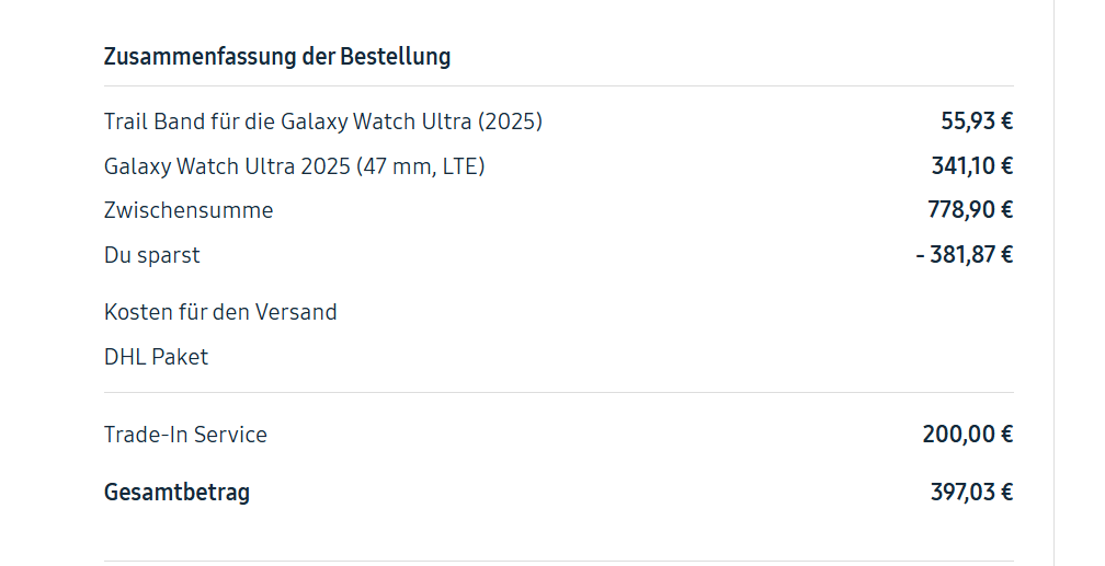 Ich komme mit dem Samsung Gutschein und einem Trade In von der alten Ultra und einem 5 % Gutschein auf 360 Euro .