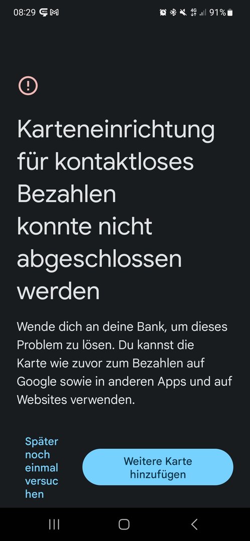 Naja ich kann die Google Pay App Installieren und beim ersten mal starten auch eine Karte hinterlegen, wenn ich dann jedoch die App neu oeffne kommt immer eine Nachricht: "Google Pay als Standard Bezahl App auswaehlen", dann komme ich in das NFC Menu wo man sich die standard Kontaktlos Bezahl App aussuchen kann und dann steht dort immer nur Samsung Pay. Lg