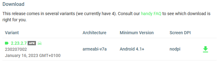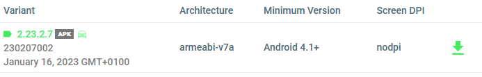 1. Laden Sie sich die neueste beta-Version von WhatsApp von APKMirror auf das Smartphone herunter, ihr müsst die Variante armeabi-v7a herunterladen! So sieht die Apk aus. Wird sicher im Laufe der Zeit geupdatet..