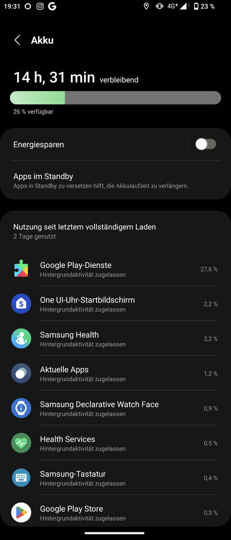 Mit der 6er normal 40mm schaffe ich 1x Nacht mit Schlaftracking und 1x Tag mit vielen Benachrichtigungen und aktivierten des Displays dabei, Anzeige bei heben,  mal WhatsApp und Workout um die 30 min.