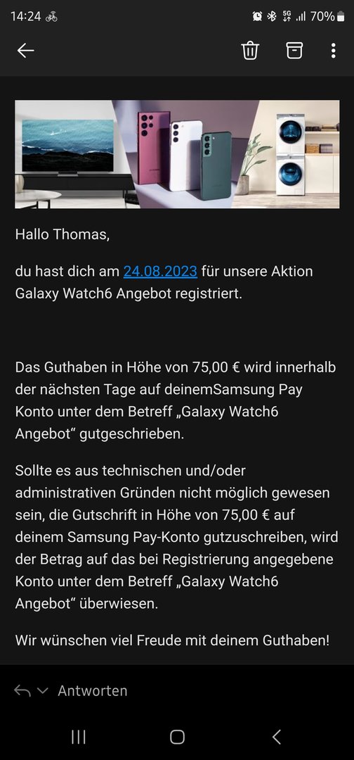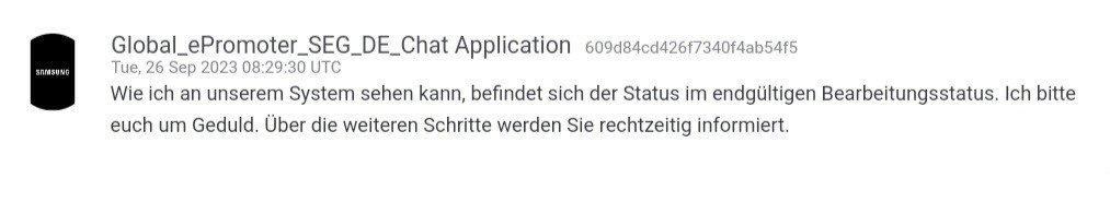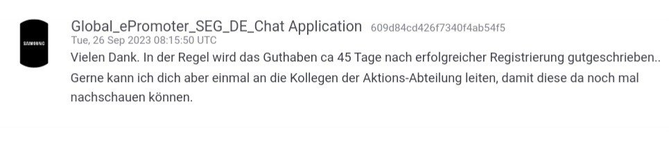 und wenn ich mich an die GW4 erinnere bei mir, dass war auch so in dem Zeitraum. Und ausgezahlt wurde mir damals der Betrag erst Mitte Oktober. Das es einige hier schon eher haben, würde ich mal als Glück bezeichnen. Ich weiss auch nicht wie Samsung da vorgeht. Ich weiss nur von der GW4 damals, dass zuerst die SPay Kunden bevorzugt werden. Also noch bin ich relativ gelassen.