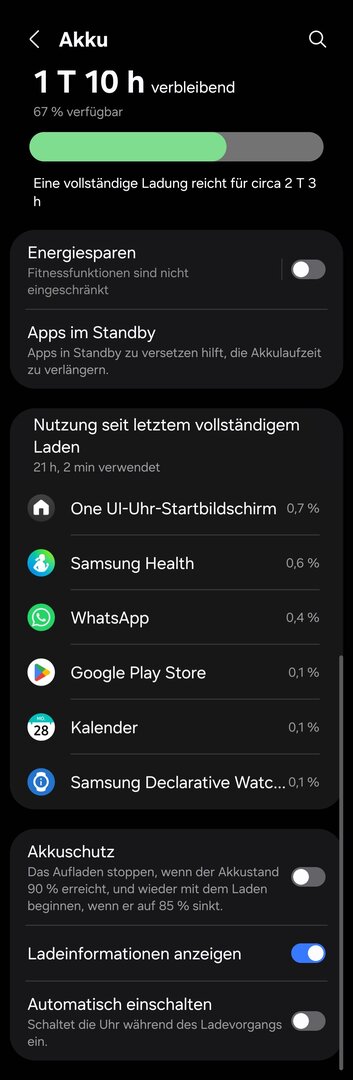 Mir ist allerdings gerade das Dashboard von Samsung negativ aufgefallen und ich nutze nun ein anderes Watchface mit deutlich geringerem Verbrauch. Meines Erachtens fehlt dem Dashboard ein echter Ambientmodus, der sich sparsamer auswirken würde.Big_Balls schrieb:Die Watchfaces von Samsung sind auch kein Problem
