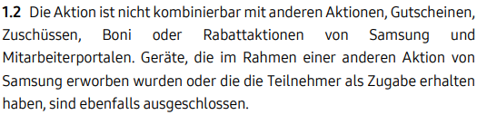 Das KANN man so lesen. Da gegenwärtig aber IMMER der Vorab-Abzug im Rahmen der AKTION mit im Spiel ist, könnte Samsung dann ja darauf abstellen, dass man diese Aktion nicht kombinieren kann. Aus der Erfahrung der letzten Jahre sollte das CashBack genau so zu verstehen sein wie man es auch verstehen muss, wenn man nicht permanent das Kleingedruckte liest. Samsung ist da in der Verklausulierung leider immer nicht ganz eindeutig. Solange alle Prozesse automatisiert durchlaufen, rechne ich damit, dass wir das Cash Back bekommen. Nur wenn's hängen bleibt und einer der MitarbeiterInnen vom Samsung Support anfängt die Bedingungen zu interpretieren, heißt es beten, dass der/die es nicht ablehnt.drug2 schrieb:Auch die 100€ Cashback darfst du nicht reinrechnen da laut Teilnahmebedingung die 100€ nicht möglich sind wenn du Rabatte und Gutschriften nutzt.