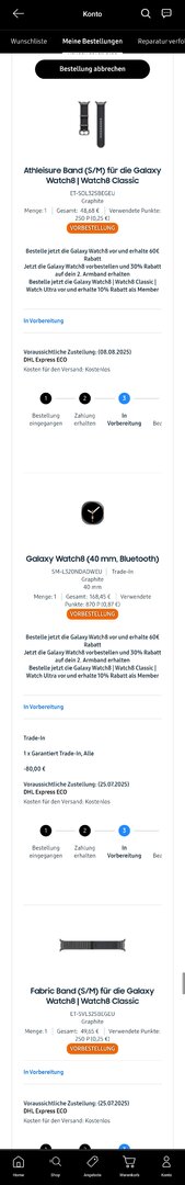 Ich habe am 23.07. bestellt und geliefert werden sollte die Uhr (Watch 8 44 mm BT) am 8.8.