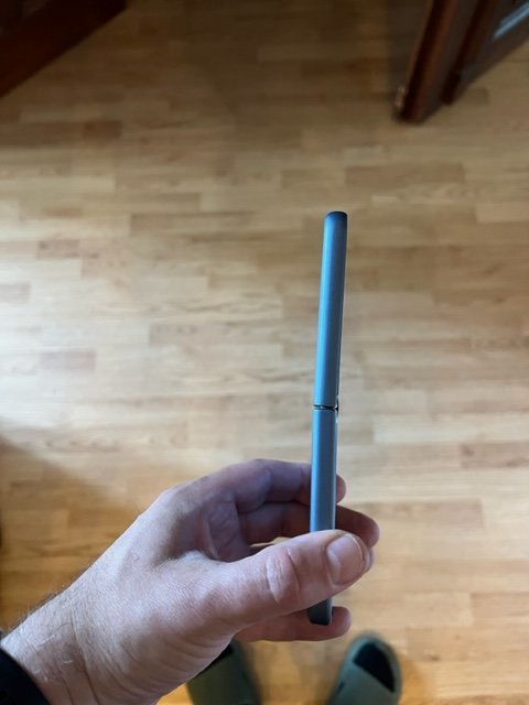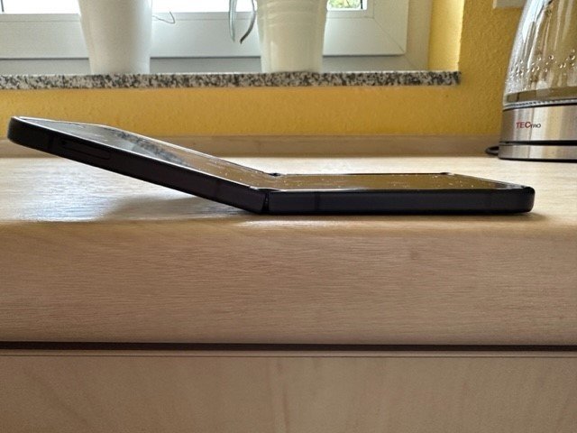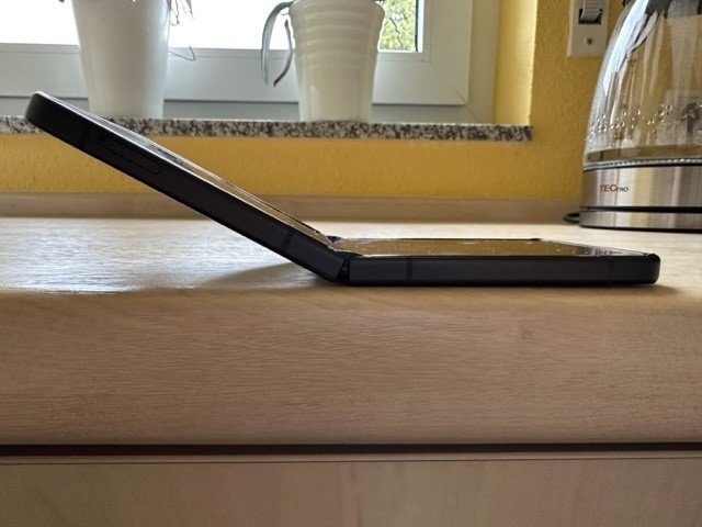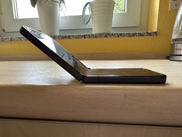 Hmm. Vielleicht kann jemand ein Foto von seinem Flip mit dem maximalen Winkel machen, bevor es von selbst aufklappt.