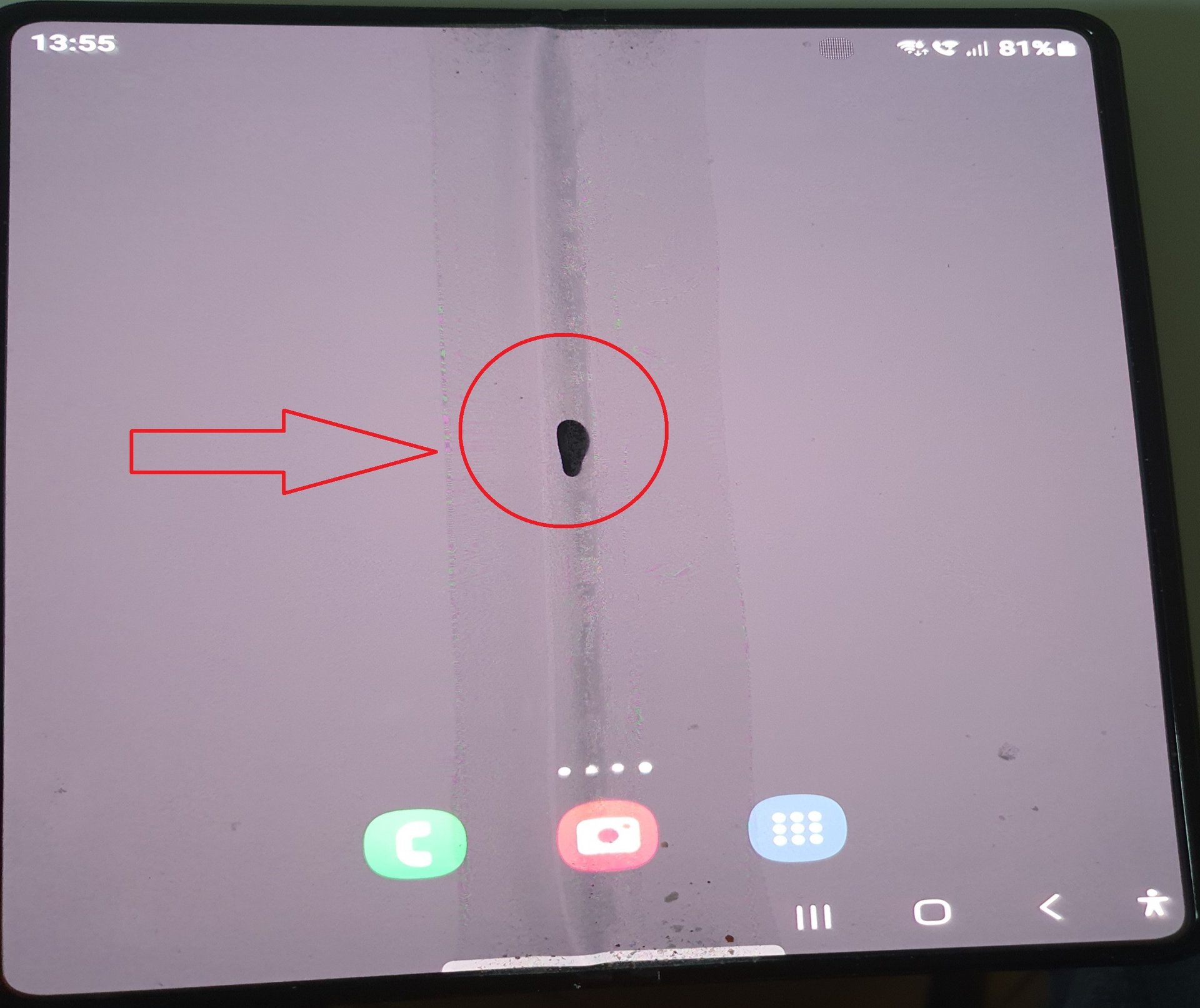Es kommt immer wieder vor, dass das Innendisplay nicht oder falsch reagiert, während dieselbe Aktion im geschlossenen Zustand einwandfrei funktioniert. Wie auf dem Bild ersichtlich, gibt es im Falz einen schwarzen Fleck, dessen Ursprung ich nicht kenne und den ich auch nicht deuten kann. Ist denkbar, dass zwischen dieser schwarzen Stelle und den Reaktionsfehlern des Displays ein Zusammenhang besteht? Falls ja, könnte ein neues Innendisplay Abhilfe schaffen?