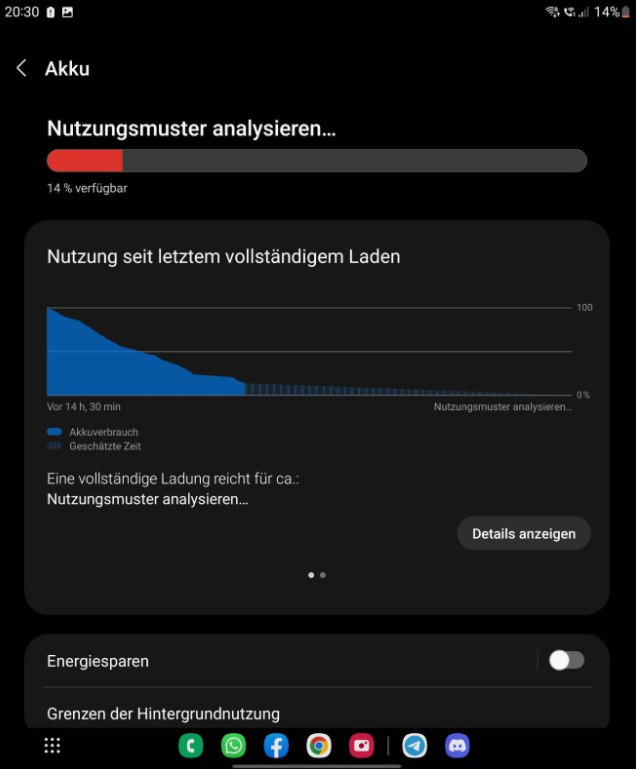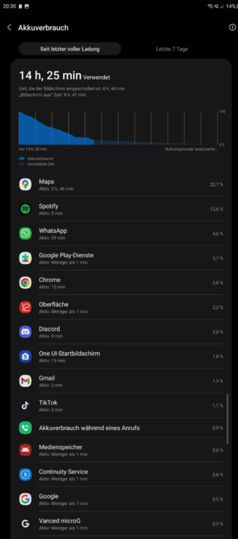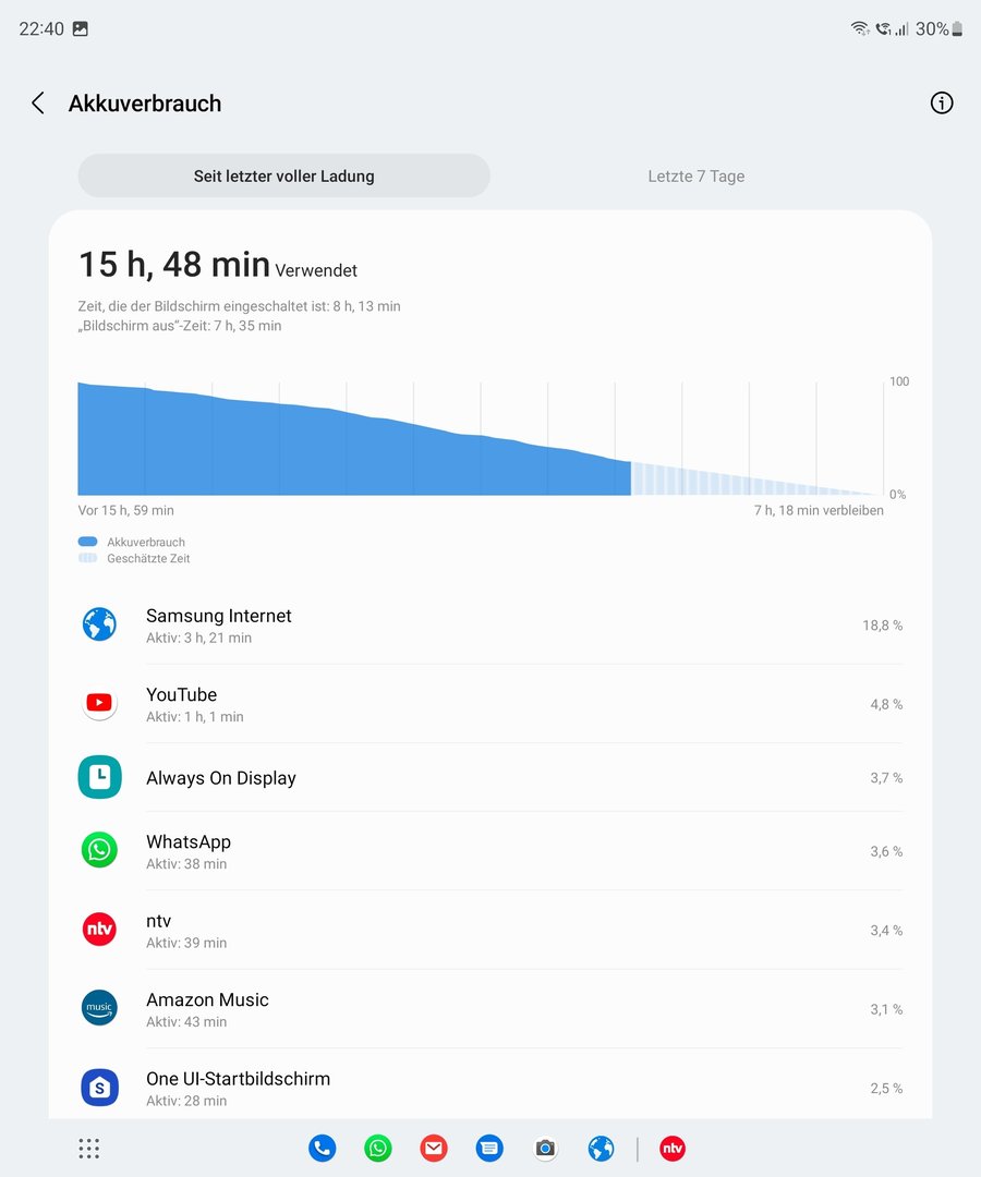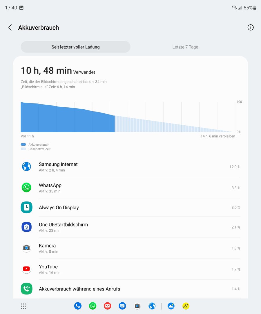Für den ersten Tag eine super Laufzeit, Ich habe auf mein S22 Ultra nicht zurück greifen müssen, das war der sprengende Punkt. Ich könnte eventuell bei dieser Prozentanzeige vielleicht noch um die 30 bis 45 Minuten SoT rausschlagen aber Ich will den Akku auch nicht ganz entleeren.