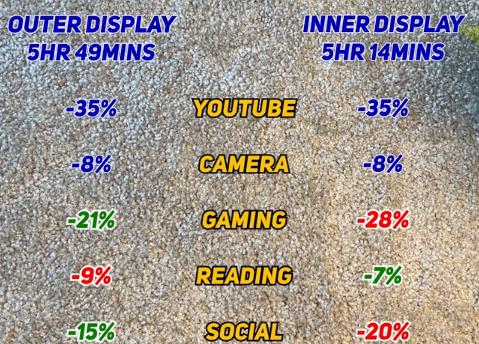 Das Hauptdisplay wurde wenns hinkommt heute max. 60 bis 70 Minuten genutzt (insgesamt) ansonsten nur das außen Display.