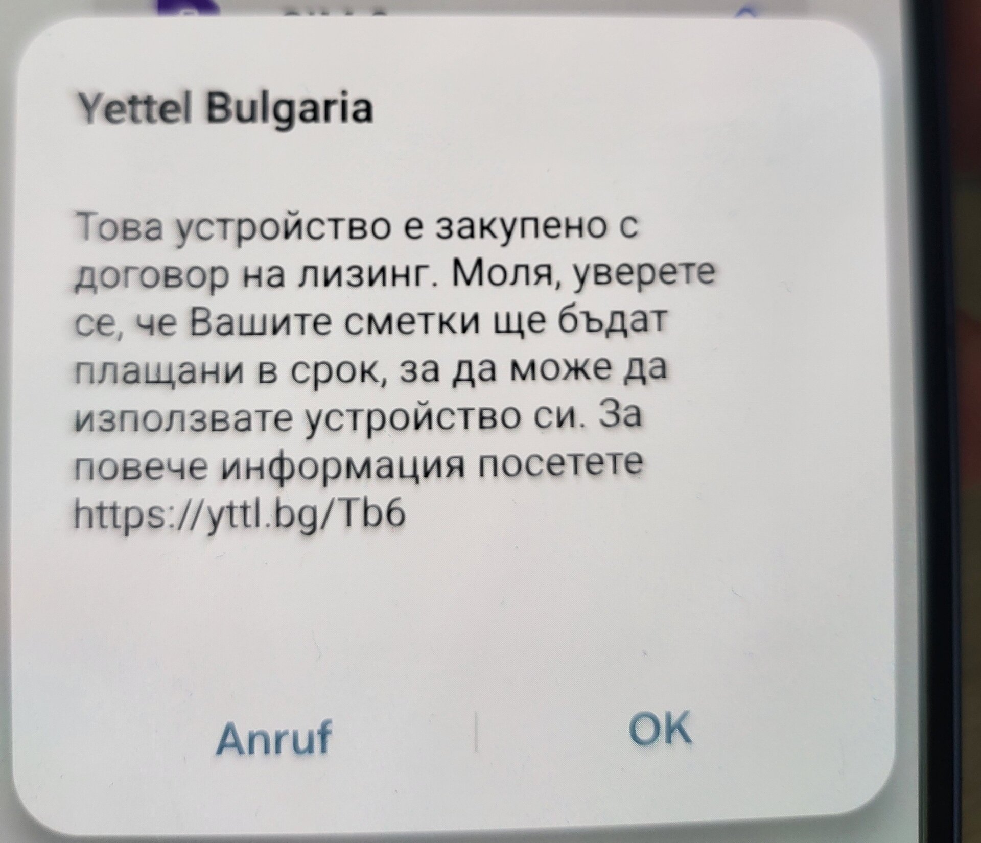 Dieses Gerät wurde im Rahmen eines Leasingvertrags erworben. Bitte stellen Sie sicher, dass Ihre Rechnungen pünktlich bezahlt werden, um das Gerät nutzen zu können. Weitere Informationen finden Sie unter https://yttl.bg/Tb6