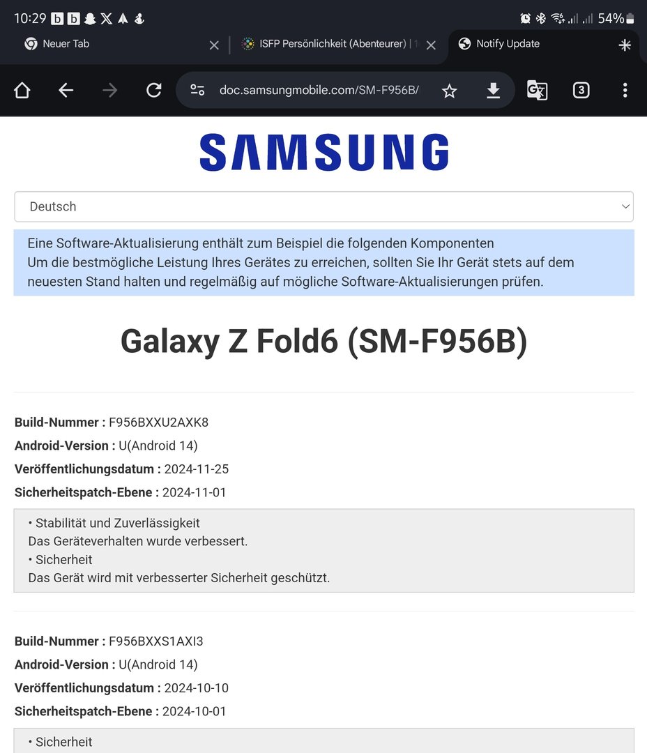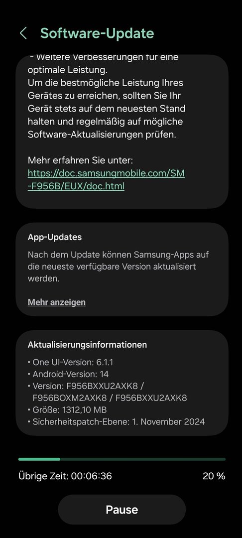 Das Z Fold 6 bekommt jetzt wohl endlich mal ein November Update. Wird laut SamMobile aktuell in Südkorea ausgerollt und ist knapp 1,2 GB groß.