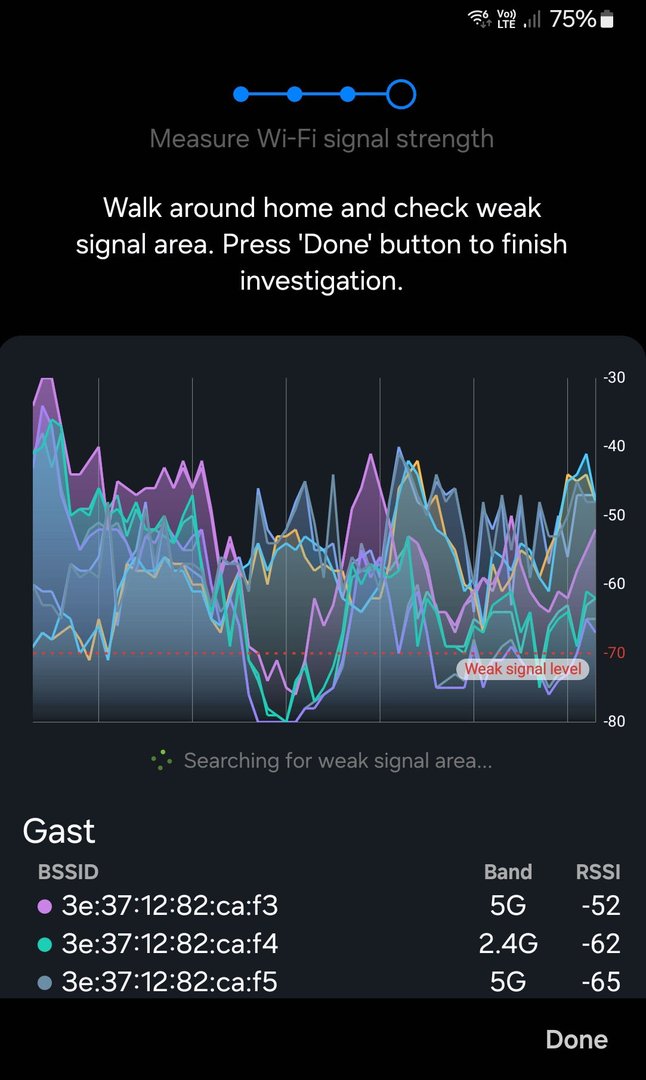Sehr spannend finde ich die Funktion Home Wi-Fi inspection. Man startet die und geht in der Wohnung umher. Es wird realtime angezeigt, wie gut der Empfang in den verschiedenen Räumen mit den unterschiedlichen Wi-Fi Modes und Frequenzen ist. Bei mir sieht das dann so aus: