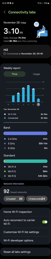 Eine Funktion, von der ich bisher nichts gelesen habe, ist die Home Wi-Fi inspection. Um die zu nutzen, muss man unter WLAN - Intelligent Wi-Fi zuerst die Connectivity labs freischalten, indem man ca. 7x auf dieses Menu klickt. Dann bekommt man die verschiedenen Informationen und Menus (in englisch) zu sehen.