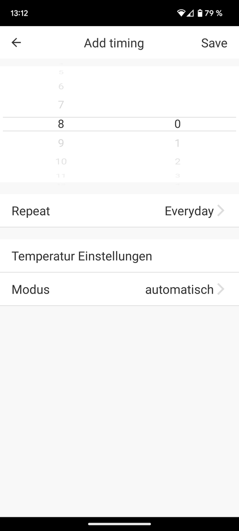 - Ich möchte gerne Zeiten einstellen wann die Thermostate welche Temperaturen machen sollen. Das scheint mir aber in der App nicht möglich. Ich kann in der App zwar Wochentage einstellen und auch eine Uhrzeit aber keine Temperatur.