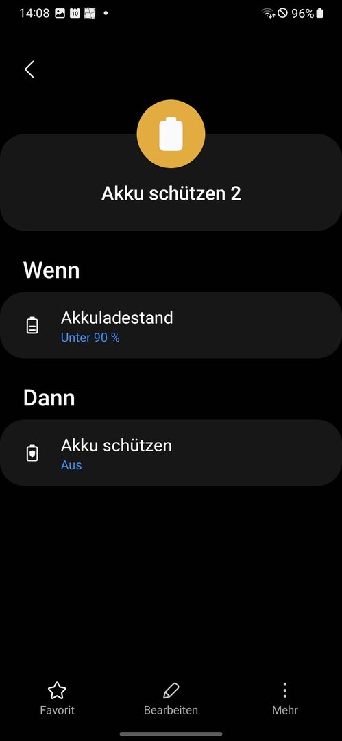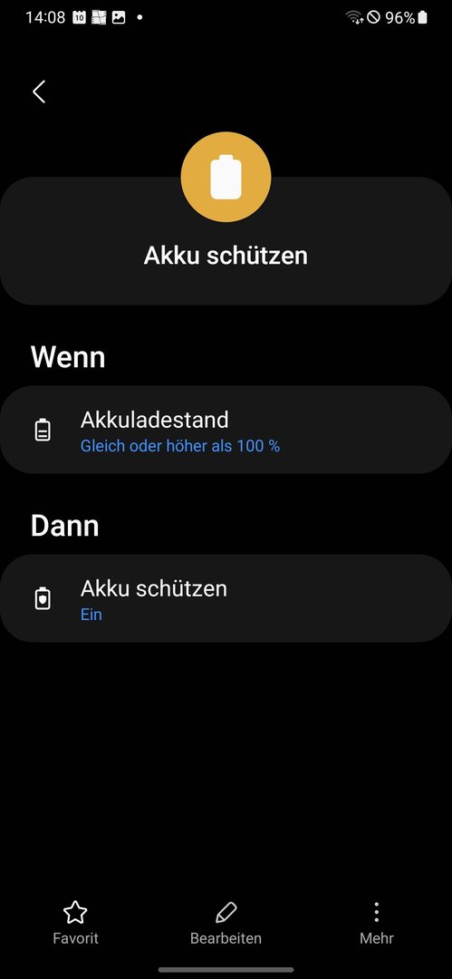 Wenn das akku auf 100 Prozent ist dann hört es ja auf zu laden weil akku schützen an geht. Akku schützen ist an bis das Gerät unter 90 Prozent ist. Unter 90 wird es sowieso nicht kommen. Da das Gerät nach einer Stunde voll ist könnte es halt sein dass in der restlichen Nacht das akku bißchen weniger wird. So 1 Prozent. Höchstens 3 Prozent. Ist nur ein Beispiel. Hab die Routine selbst noch nicht ausprobiert.maik005 schrieb:Wenn du morgens 97% hast stimmt da aber etwas nicht.